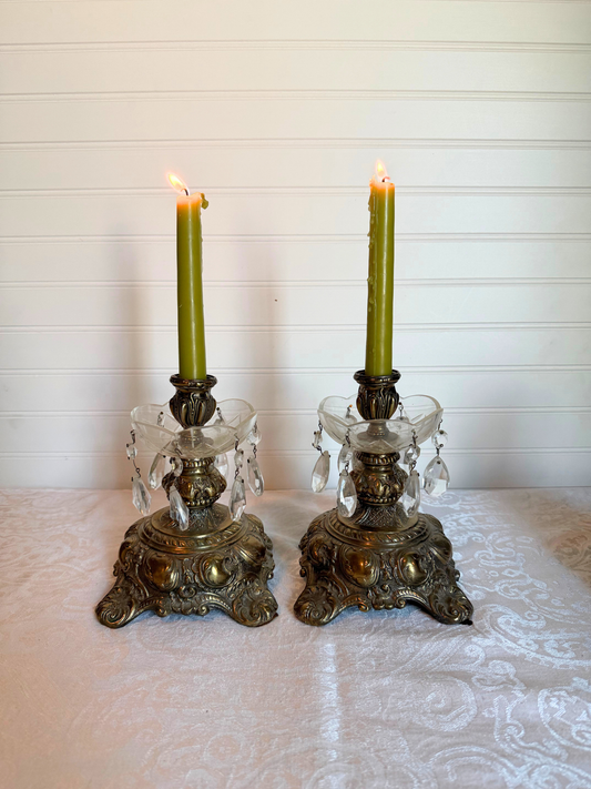 Ornate Brass Candle Holders with Crystals