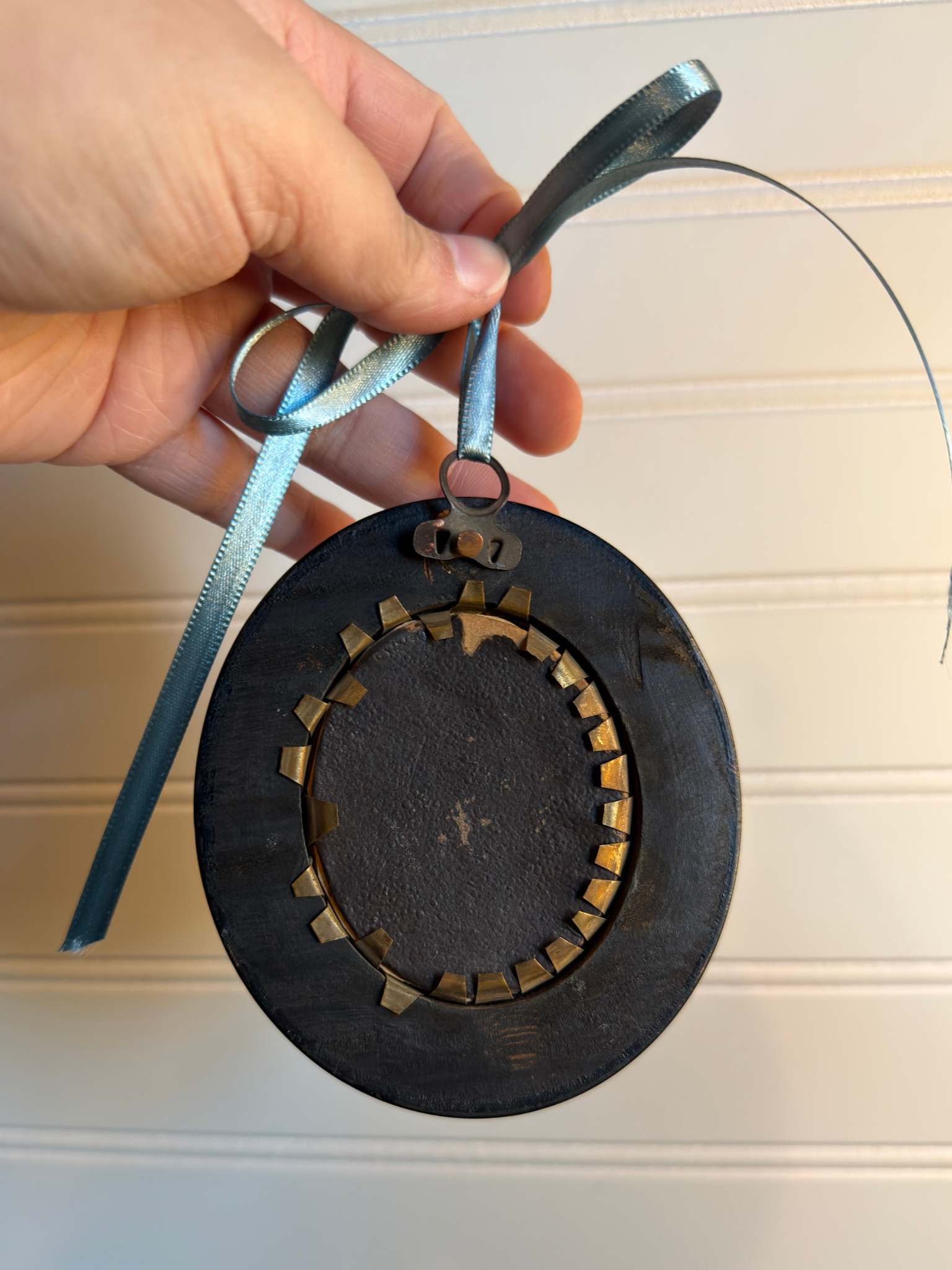 This 19th-century silhouette portrait of a lady is presented in a black frame with a gold brass inner border, ready to hang. Antique silhouette portraits were a popular form of portraiture in the 18th and 19th centuries, created by cutting profiles from black paper to capture a subject’s likeness with elegant simplicity. The frame is made of wood with a finely detailed brass inner edge, complementing the classic black silhouette. A removable blue satin bow adds a charming touch, making this piece a beautiful example of historic artistry and decorative elegance.