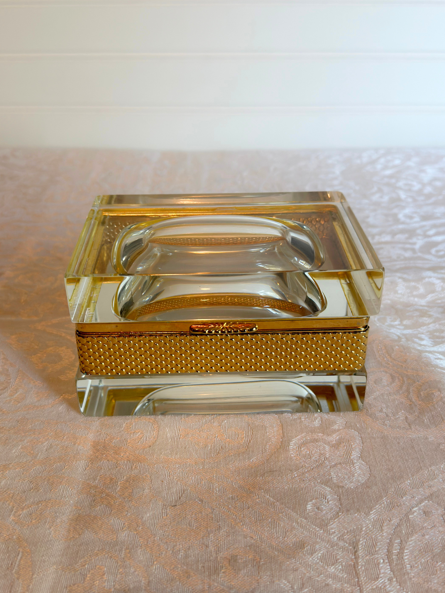 This vintage piece is attributed to Alessandro Mandruzzato, a fourth-generation Murano glassmaker. It is made of thick glass and possibly 24k gold-plated brass fittings, which show slight patina spots in some areas due to age and use. There are no chips or cracks. On the front of the casket, just beneath the lower gold rim, there is a subtle maker’s mark in the glass—two small swooped dips where the glass briefly curves inward before returning to a straight line. It works beautifully as a functional jewelry box or as a display piece on a vanity, bookshelf, or side table.