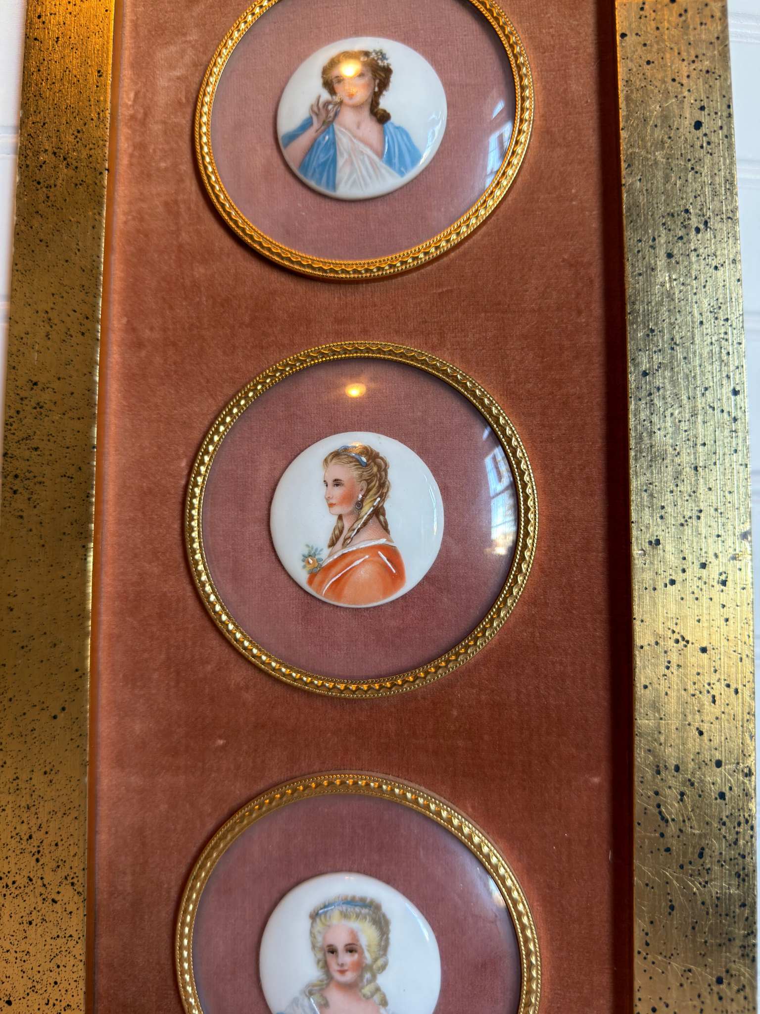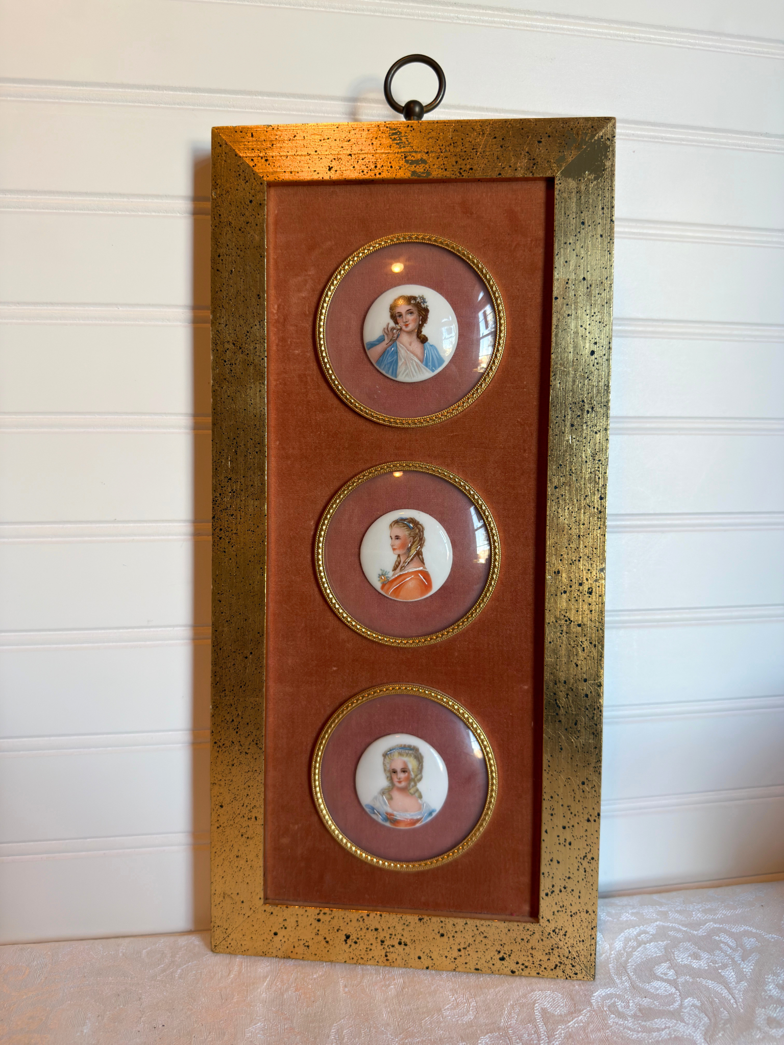 This gold frame features a peachy-pink velvet background and holds three portrait prints in thin brass frames with convex glass. Each portrait is enhanced with subtle paint strokes: the top lady has light brown hair and wears a blue and white dress, the middle lady has blonde hair in an orange dress, and the bottom lady has white hair in a blue, white, and orange dress. All three have a flower in their hair, adding a delicate, whimsical touch. The frame includes a hook at the top and a wire on the back for easy hanging, making it a charming and distinctive piece for any wall.