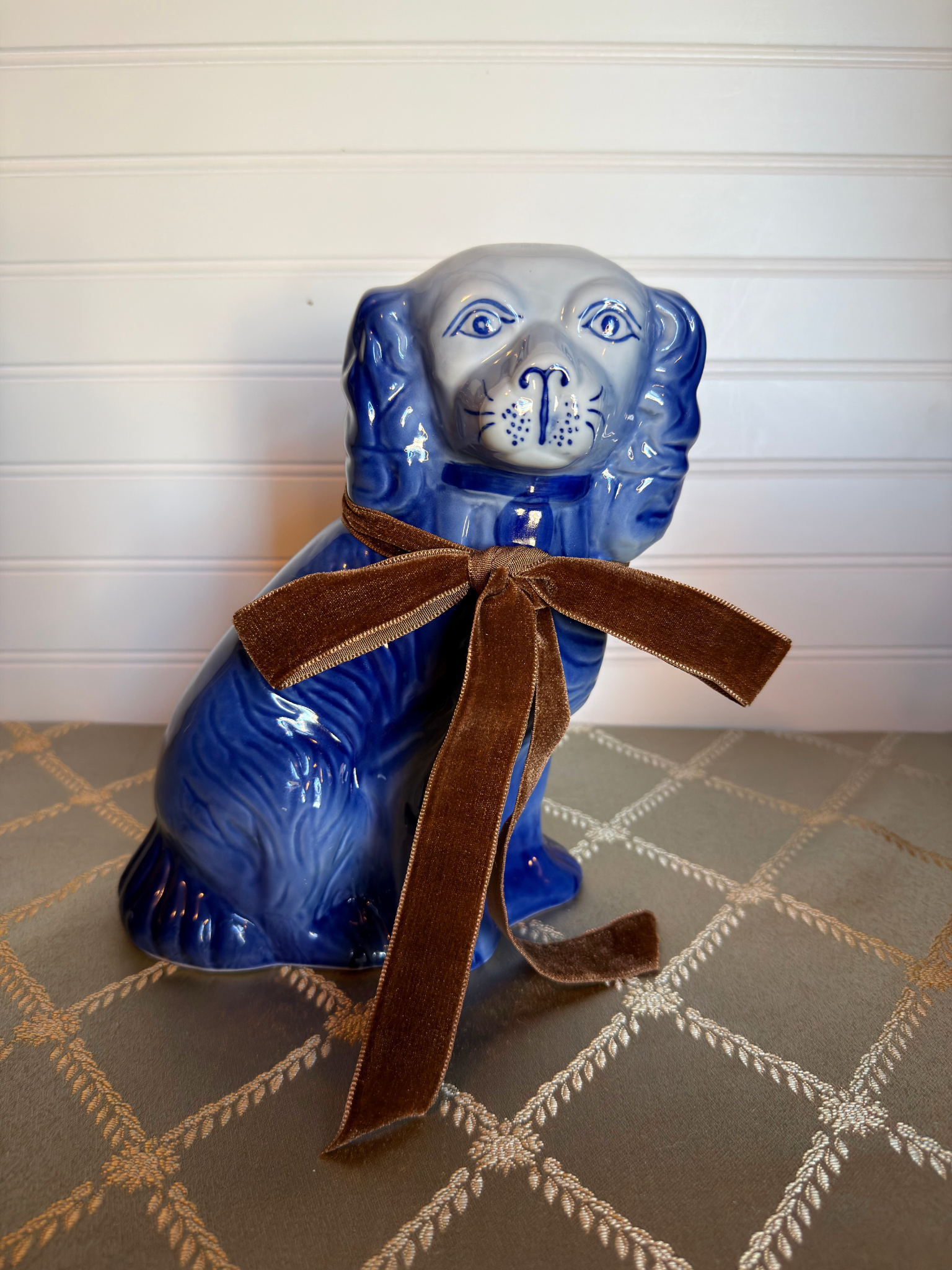 These two vintage reproduction Staffordshire dog figurines both face to the right and were originally part of a pair. Their classic blue-and-white coloring and charming design make them versatile decorative pieces, perfect for display on a table, mantel, or shelf. A lovely addition for collectors or anyone looking to add a touch of timeless Staffordshire charm to their home.