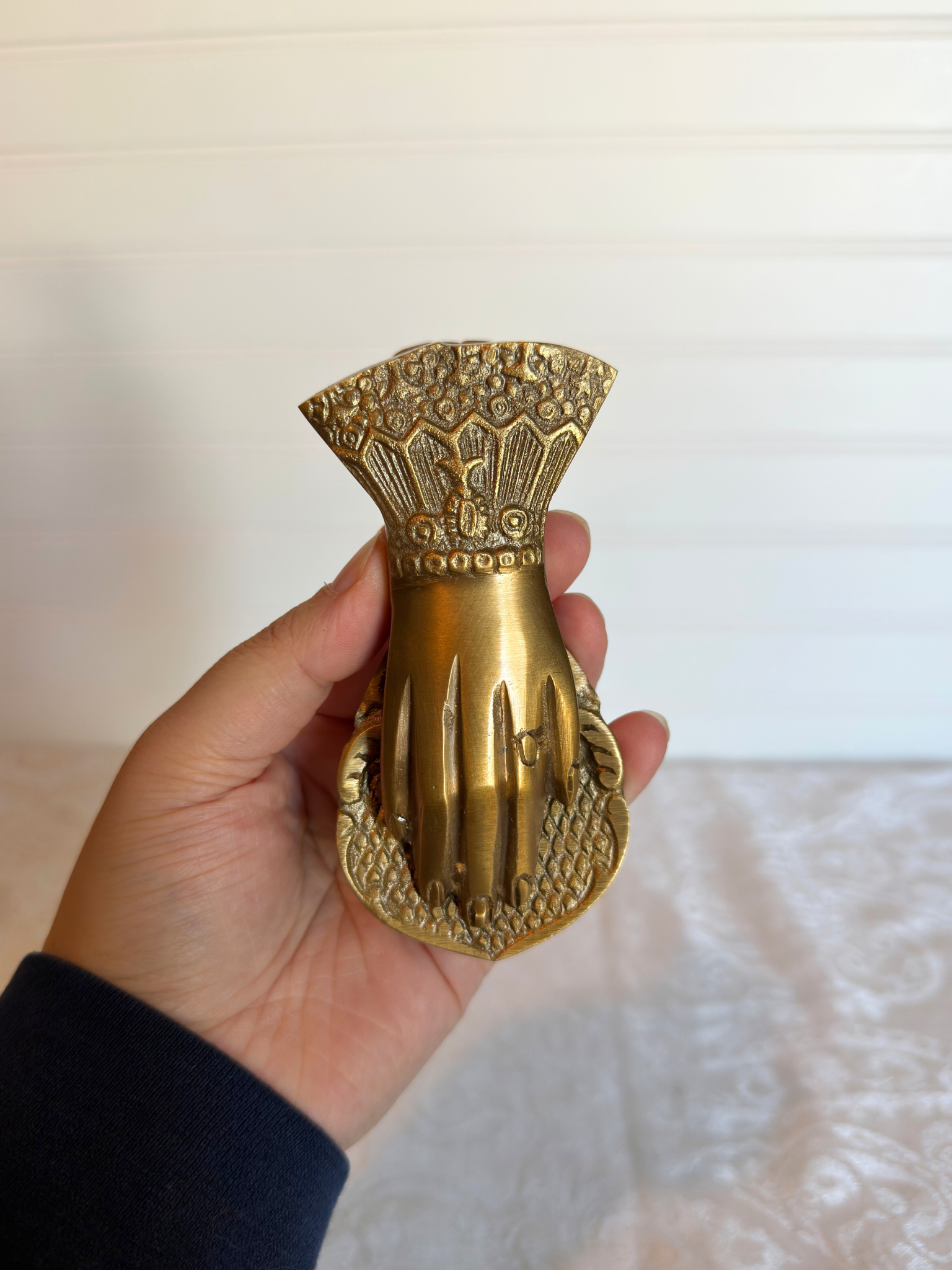 This is a large brass hand clip featuring an ornate sleeve and a ring on the pointer finger, with a hole on the back for hanging on the wall. Each clip can be styled on an open book, used to hang hand towels in a bathroom, or hold a piece of unframed art. These decorative clips combine elegant design with practical functionality for display and organization.