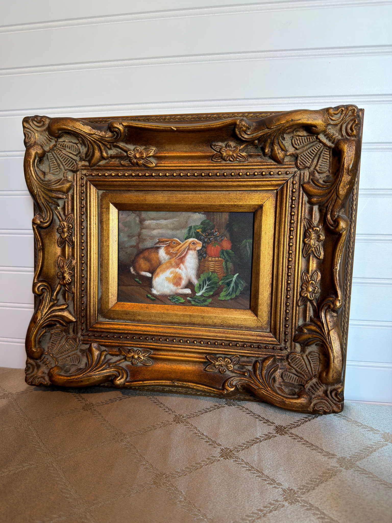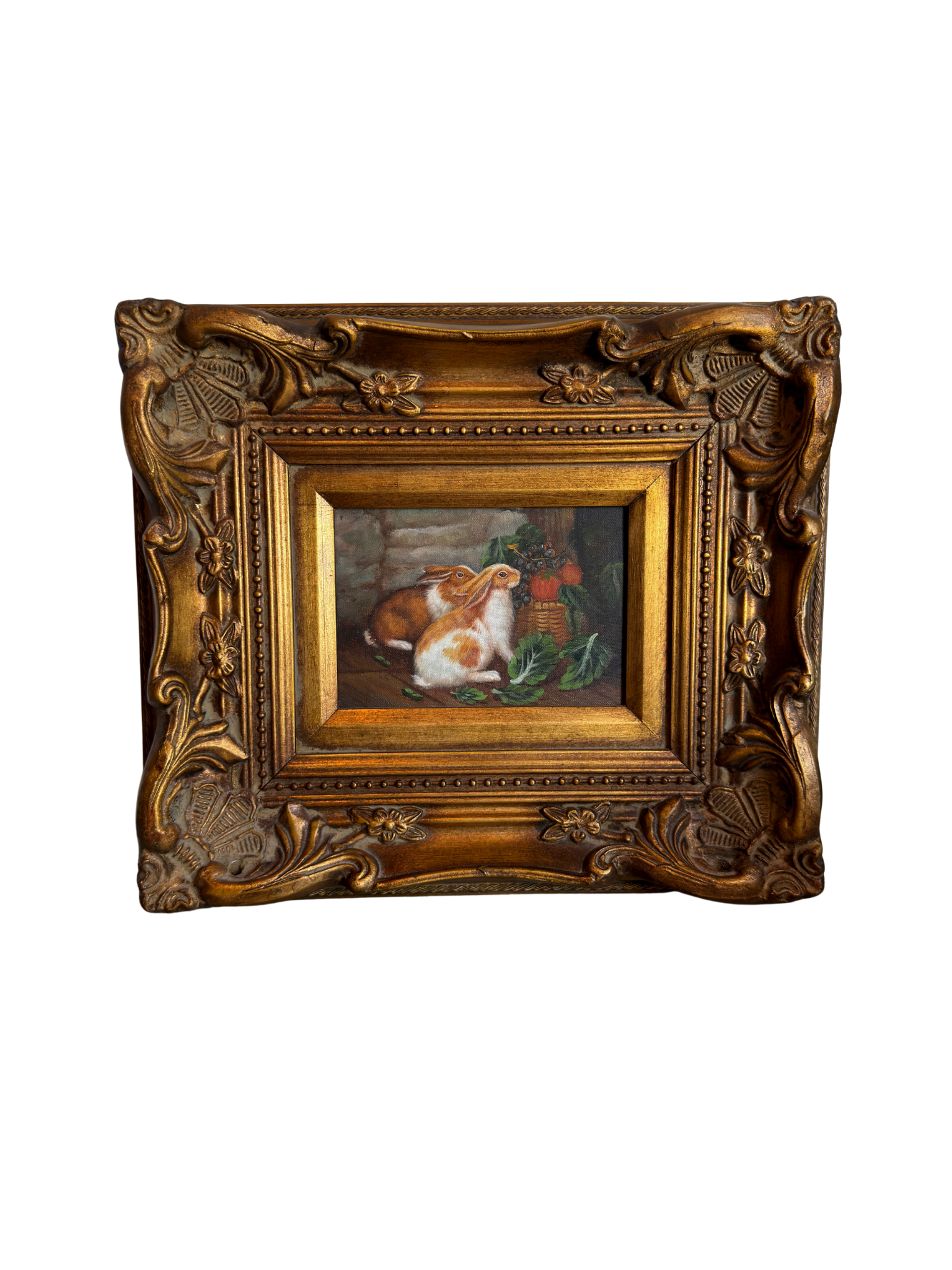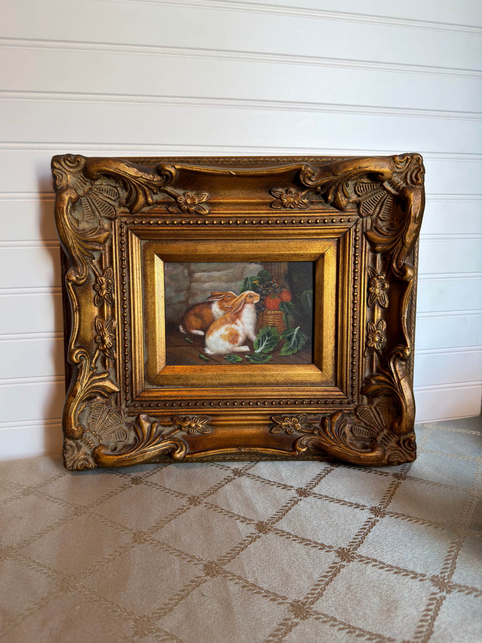 This charming painting features two bunnies beside a basket of fruit, with leaves scattered on the floor around them. Set in a chunky, ornate frame, it’s a lovely piece that adds a touch of warmth and character to any space.