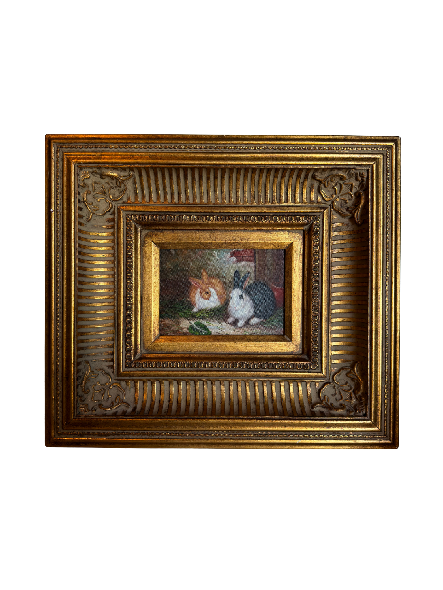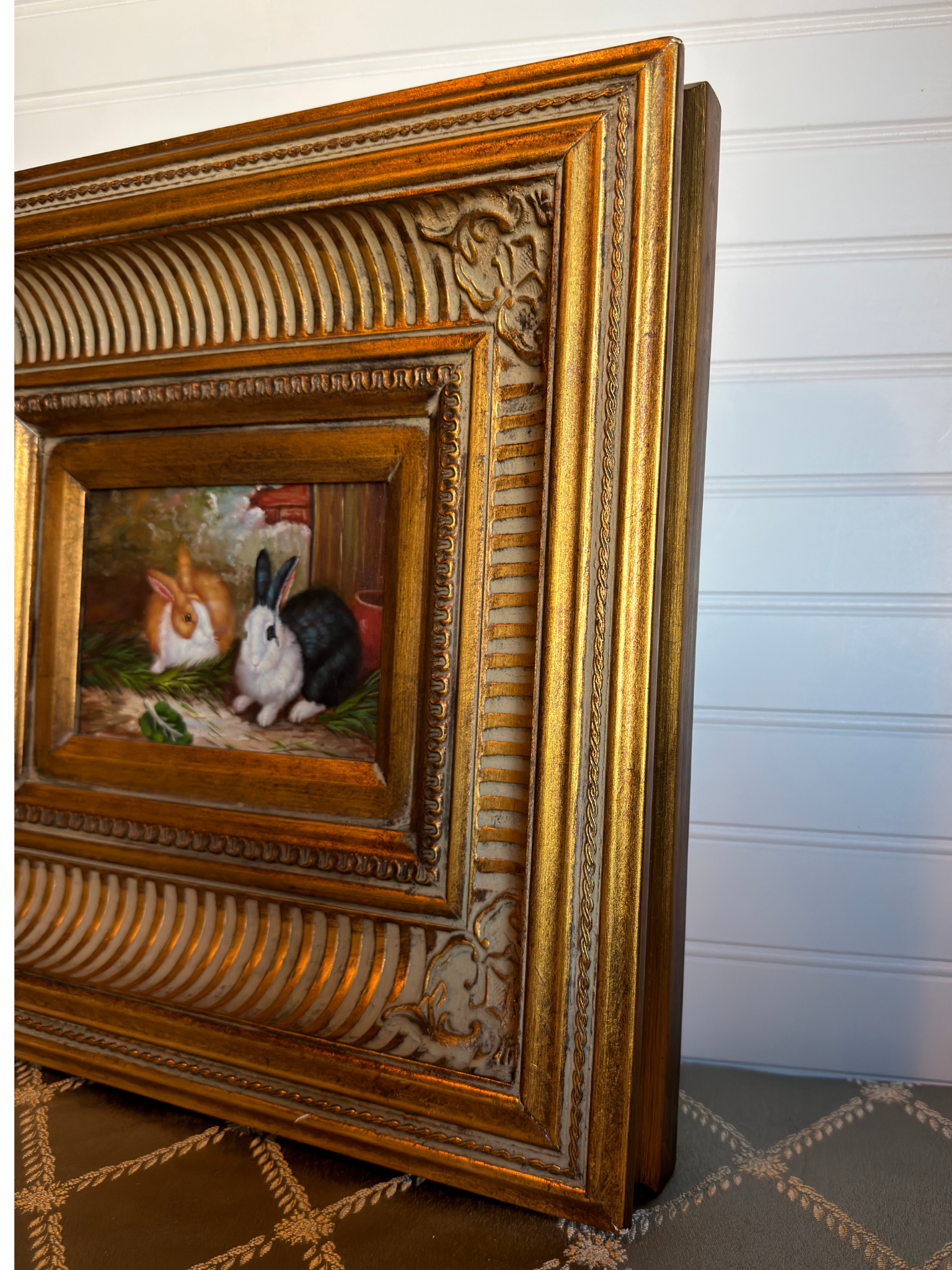 This charming vintage painting features two sweet bunnies nestled in grass and hay, with a piece of lettuce nearby.One bunny has soft light orange and white fur, while the other is painted in classic black and white, creating a warm and timeless scene. The artwork is set in a chunky, heavy gold ornate frame that adds beautiful depth and character and is ready to hang. A beautiful piece that brings a gentle sense of whimsy and classic charm to any space.