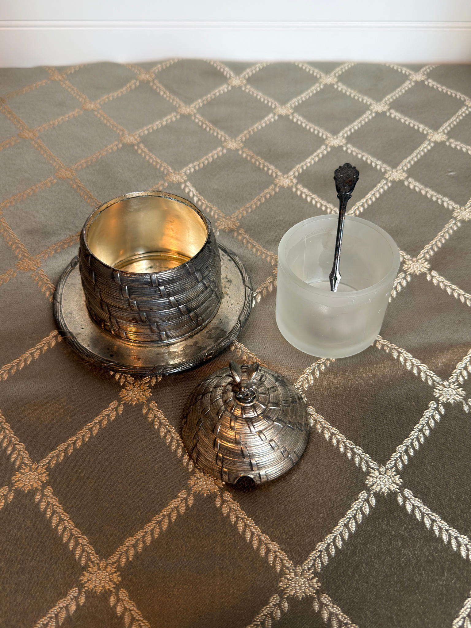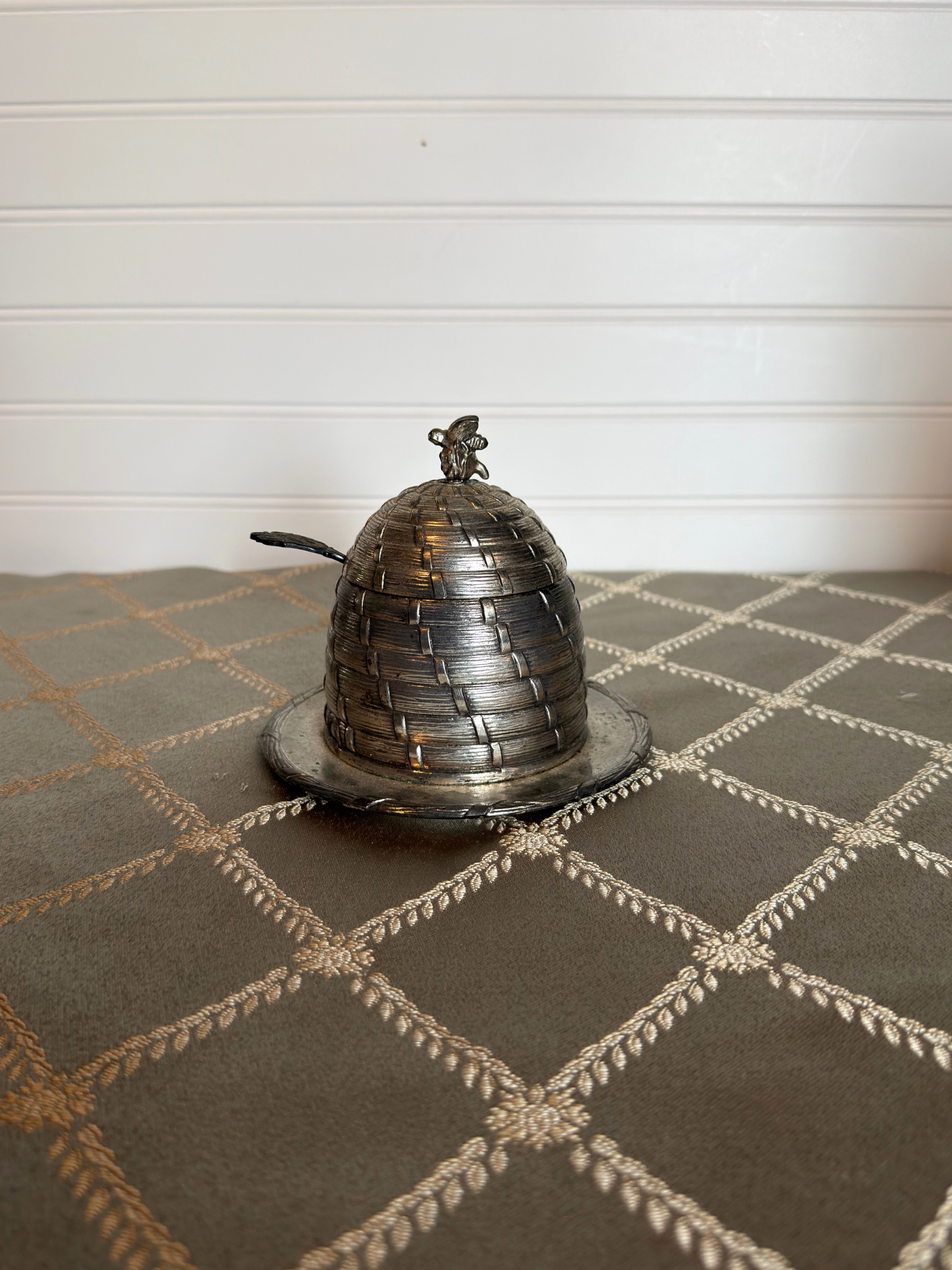 This charming silver-plated beehive honey pot by Corbell & Co. features a frosted glass insert for honey and a matching silver-plated spoon adorned with a delicate bee detail. Corbell & Co., established in London in 1946 and later relocating to Los Angeles in 1951, became renowned for high-quality silver-plated items inspired by traditional designs. Perfect for serving honey alongside cheeses and fruits, this honey pot makes an elegant addition to a charcuterie board while also serving as a delightful decorative piece for the kitchen or dining table.