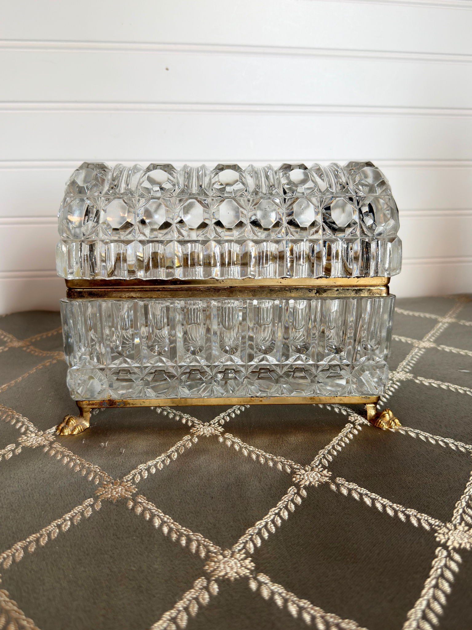 This elegant cut glass jewelry casket features a dome-shaped design with thick, heavy panels and brass trim, resting on detailed lion’s feet. The brass has developed a natural patina over time, adding character and vintage charm to the piece. Perfect for storing jewelry or small keepsakes, this casket combines classic beauty with a sense of history, making it a striking addition to any dresser or vanity.