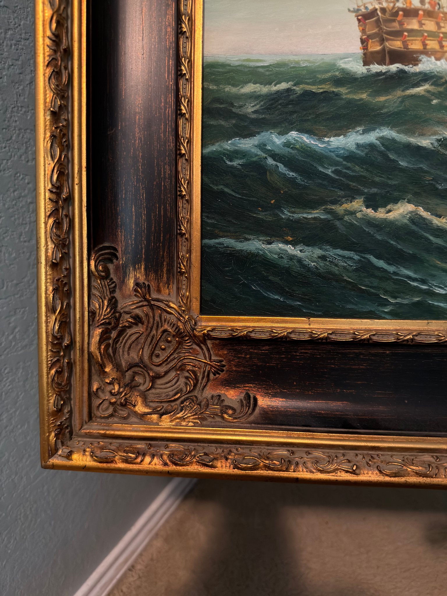 This large moody seascape painting on canvas features three ships navigating choppy waves beneath a dramatic, storm-filled sky. The central ship carries a Netherlands flag, the ship on the right flies a British flag, and the vessel on the left sails without a flag. The piece is signed βBrownβ at the bottom right. Itβs set in an ornate black and gold frame and comes ready to hang with a wire on the backβa striking statement piece full of atmosphere and movement.
