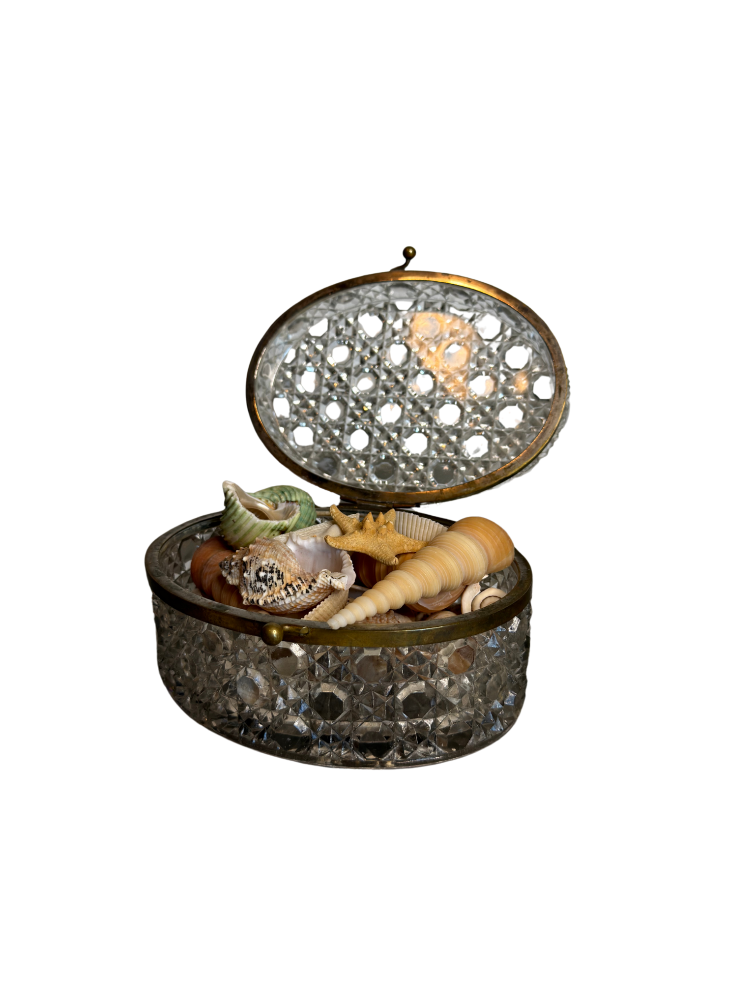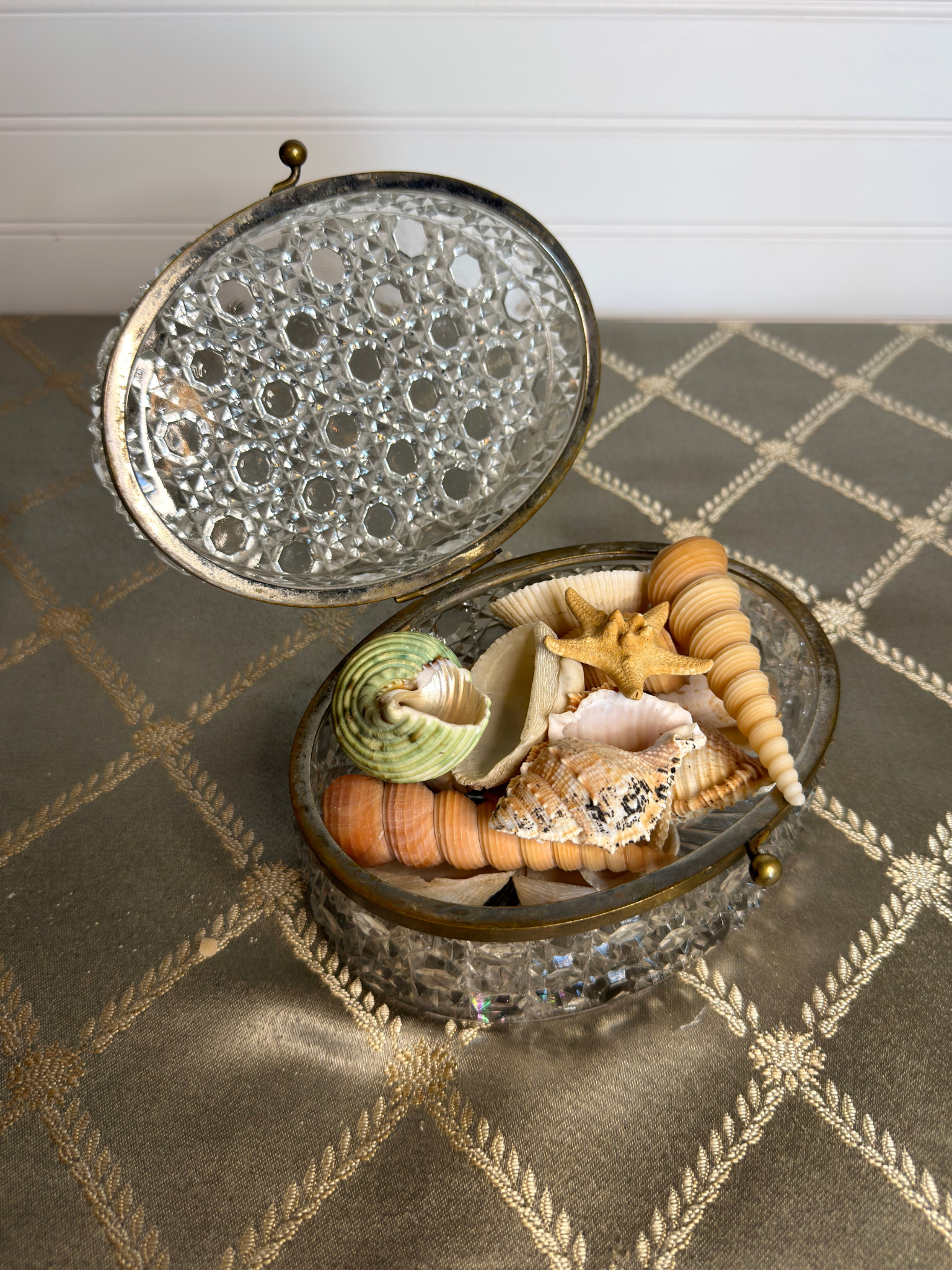 This Brockway glass jewelry casket is a beautiful vintage piece from the renowned Brockway Glass Company, an American glassmaker established in the early 20th century, celebrated for its elegant pressed glass designs. Its versatile design makes it perfect for holding everyday jewelry on a vanity or bathroom, or as a charming display piece on a coffee table or shelf with seashells, matchstick books, or other small treasures.