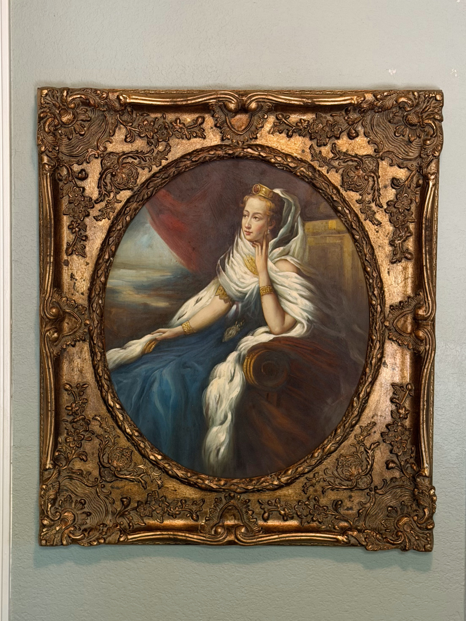 This is a vintage reproduction painting of an 1862 portrait of Eugenie de Montijo, Empress of France and wife of Napoleon III. The original painting was created by Franz Xaver Winterhalter. He was known for his elegant portraits of European royalty and high society.