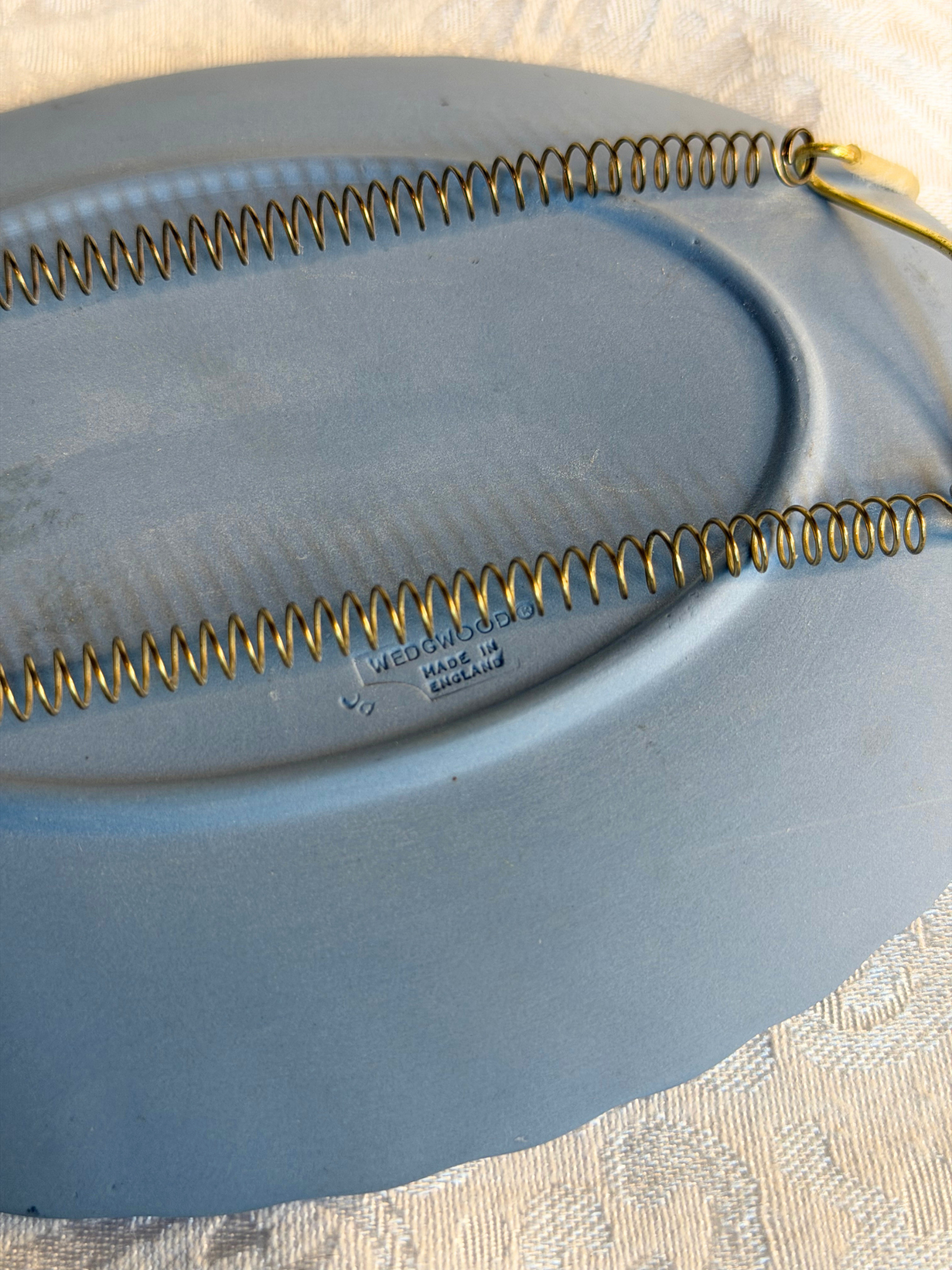 This is a larger Wedgewood Jasperware plate in the classic powder blue color, featuring delicate floral details in the center as well as at the top and bottom. It comes with a plate hanger, making it perfect for a plate wall, or the hanger can be removed to use the plate as a trinket dish or a decorative accent on a bookshelf.
