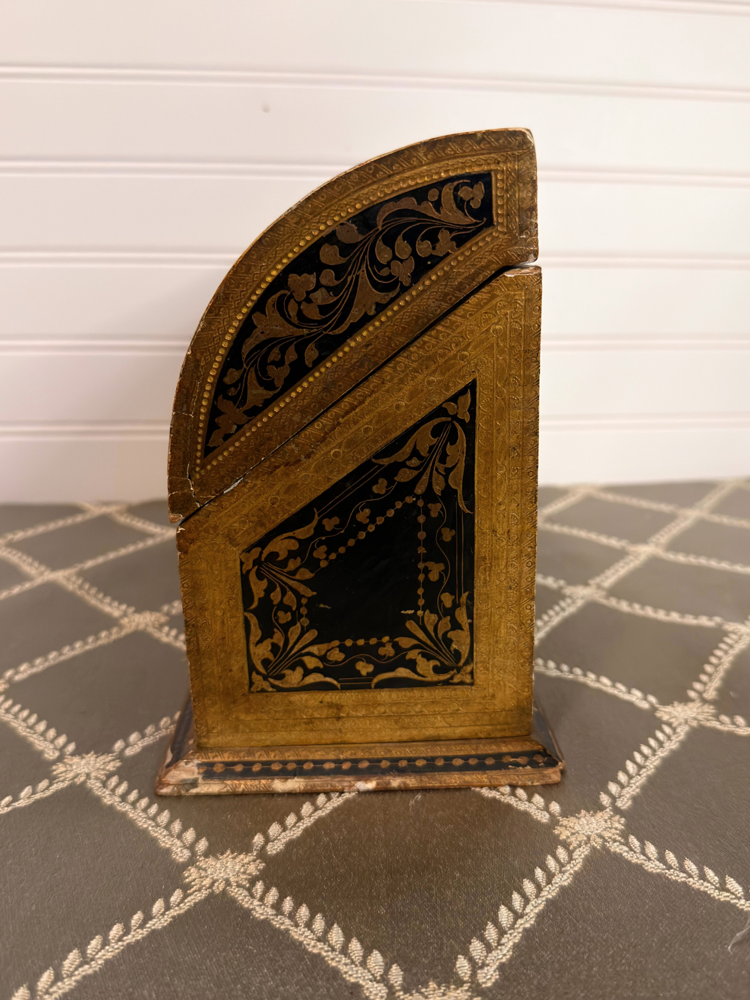 This made-in-Italy Florentine stationery box features a charming dome shape with floral and acorn detailing, showcasing the classic gilded Florentine style. The interior is lined in soft pink and includes three slots for organizing papers. This piece has been well loved, with chips and paint loss throughout, adding to its vintage character and timeless charm.