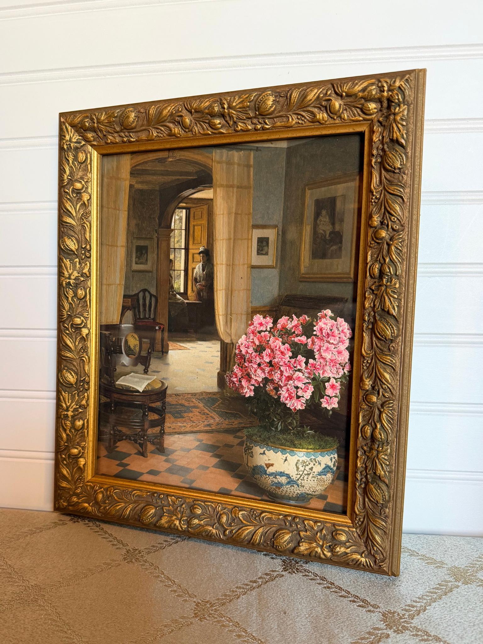 This is a framed giclée print of Fresh from the Greenhouse (1885) by British artist Jessica Hayllar, known for her beautifully detailed domestic interiors and still-life scenes. The artwork depicts freshly cut flowers arranged in the foreground, with a lady in the background—capturing a serene glimpse into Victorian life.