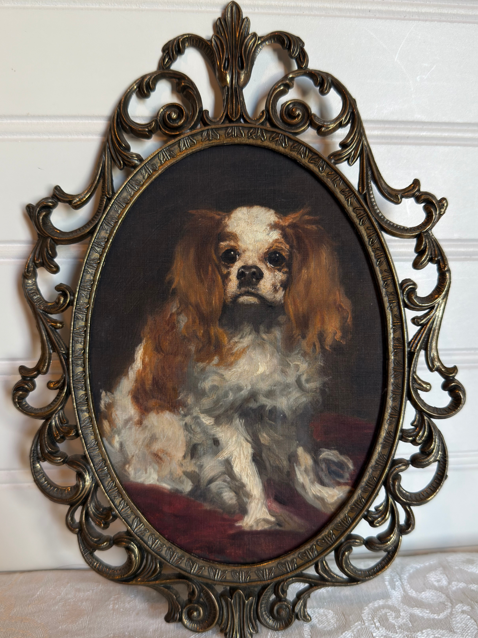 This framed print features A King Charles Spaniel by Édouard Manet, the renowned 19th-century French painter celebrated for his role in the transition from Realism to Impressionism. The dog, white with orange-tinted fur, is depicted sitting on a rich dark red pillow, exuding charm and character. The print is set in an ornate brass frame and comes ready to hang, making it a delightful addition to any home or art collection.
