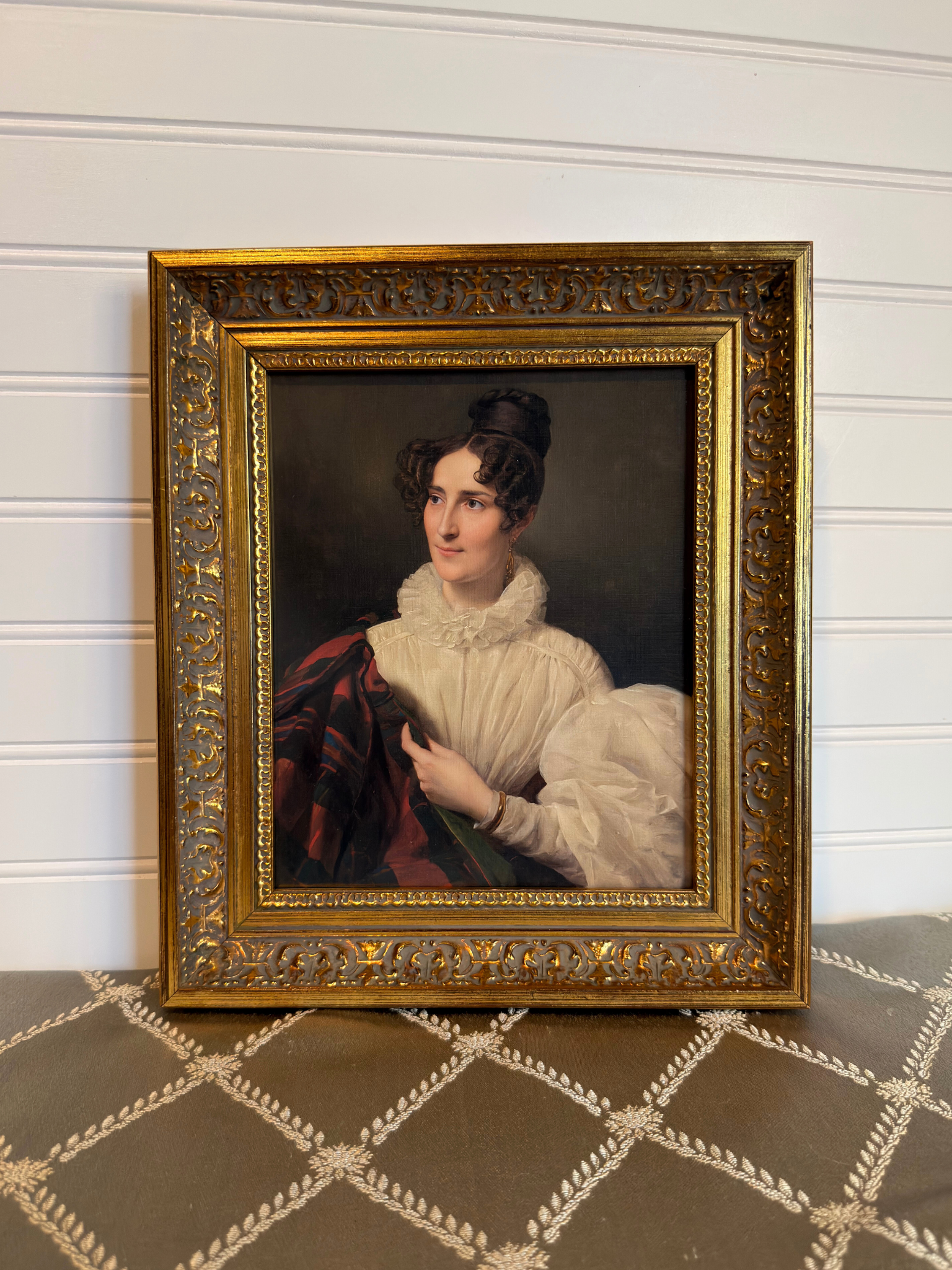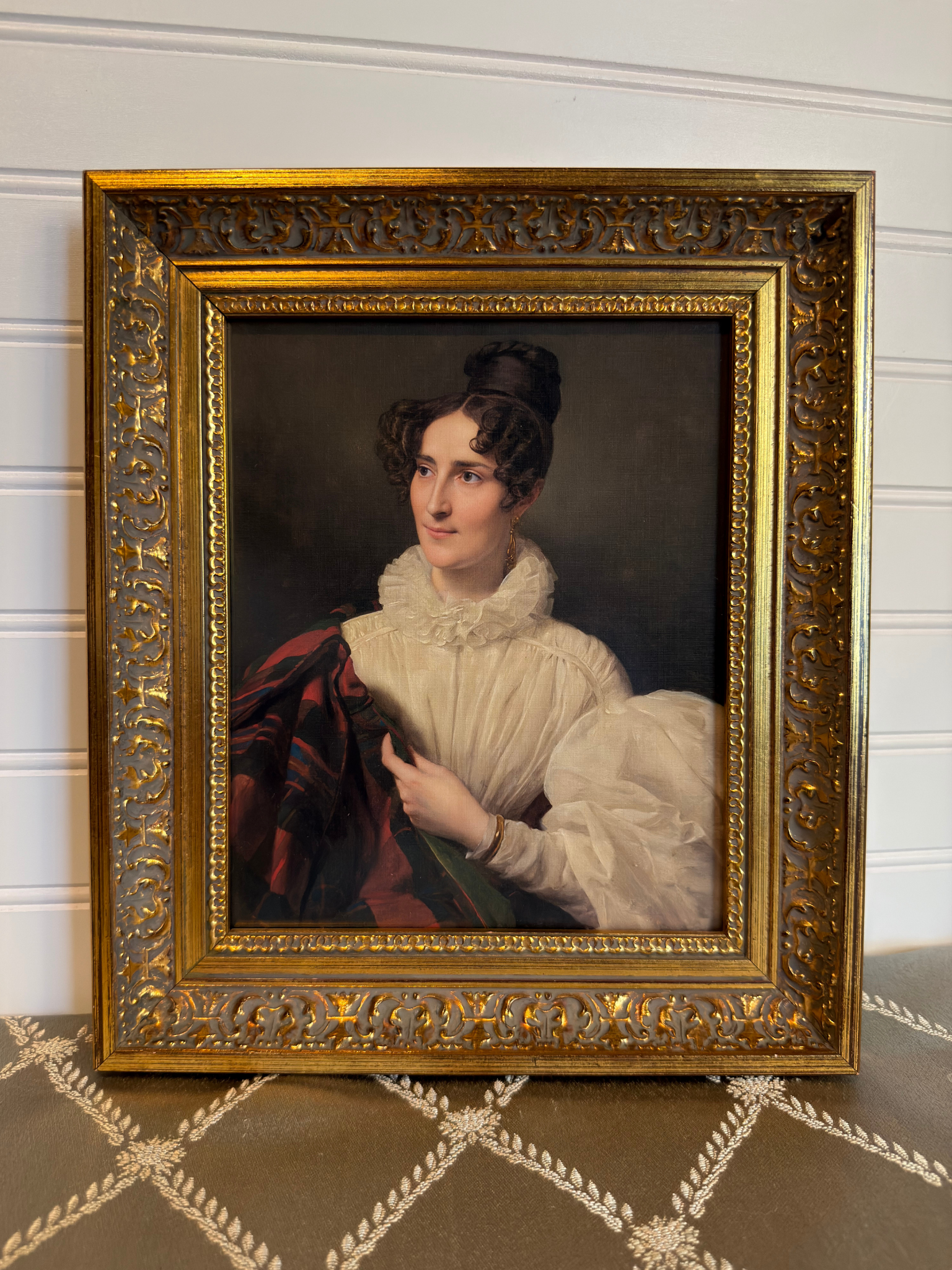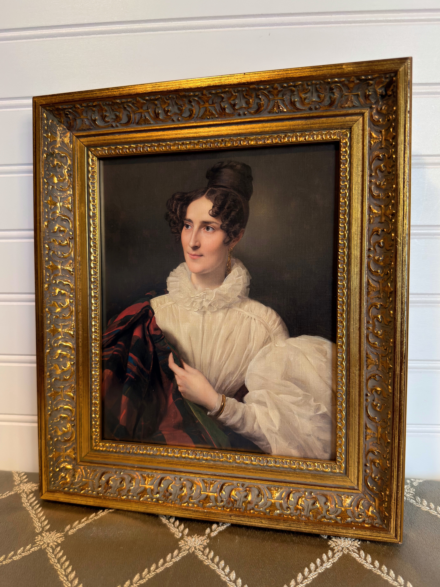 This print features a graceful lady in a white dress, inspired by the work of Ferdinand Georg Waldmüller(1793–1865), the celebrated Austrian painter of the Biedermeier period. While the identity of this particular sitter is not confirmed, some believe she may be Elisabeth Waldmüller, the artist’s mother. Elisabeth was also painted by Waldmüller in 1830 in a dignified portrait now in Vienna’s Belvedere Museum.
