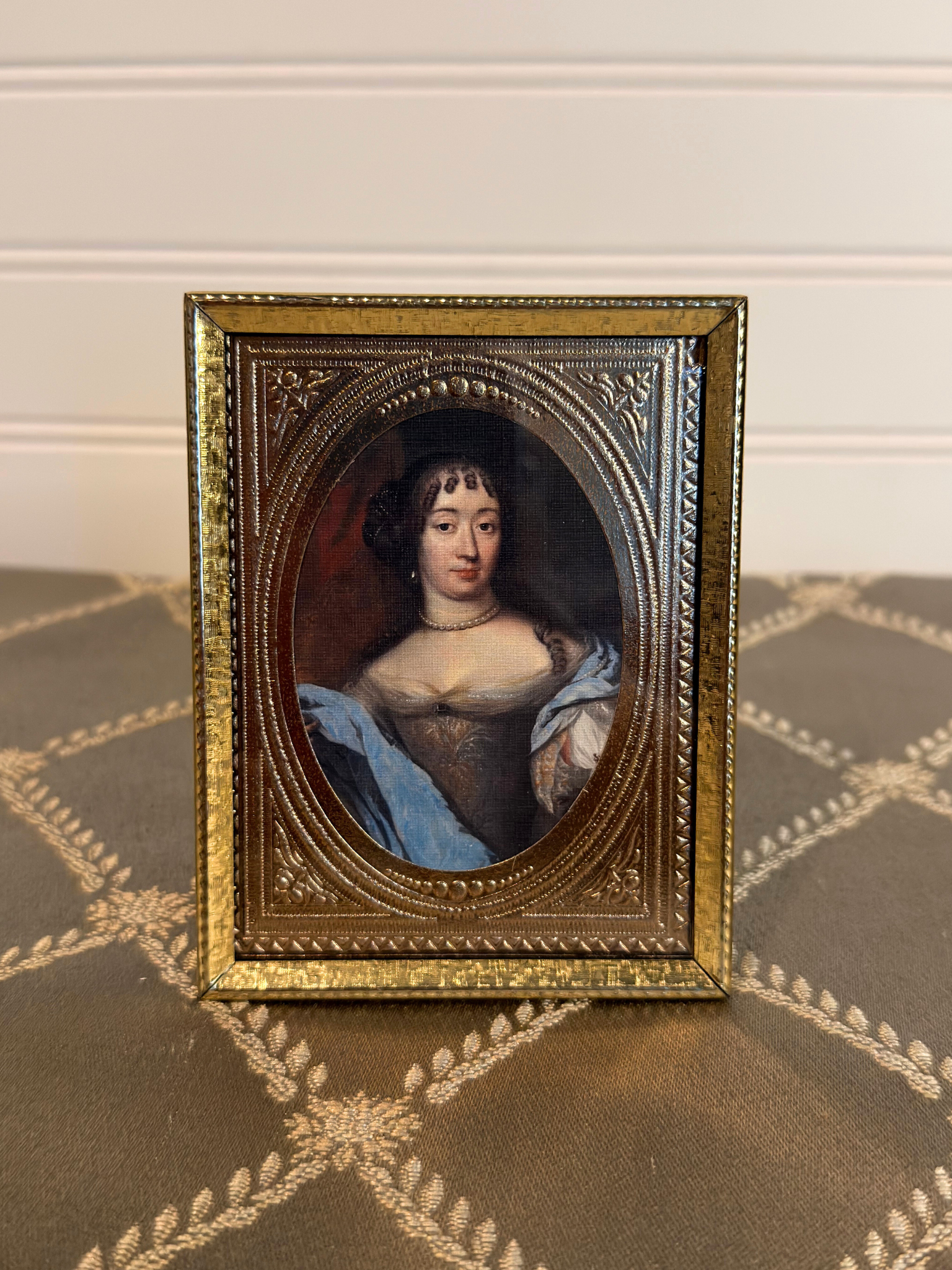 This print features Johanna le Gillon (1635–1706), a Dutch noblewoman celebrated for her musical talent and refined presence, painted by Jean de Baen, a prominent 17th-century Dutch portraitist known for his elegant and detailed depictions of the Dutch elite. The print comes in a gold metal frame that has a stand, making it perfect for display on a tabletop or shelf.