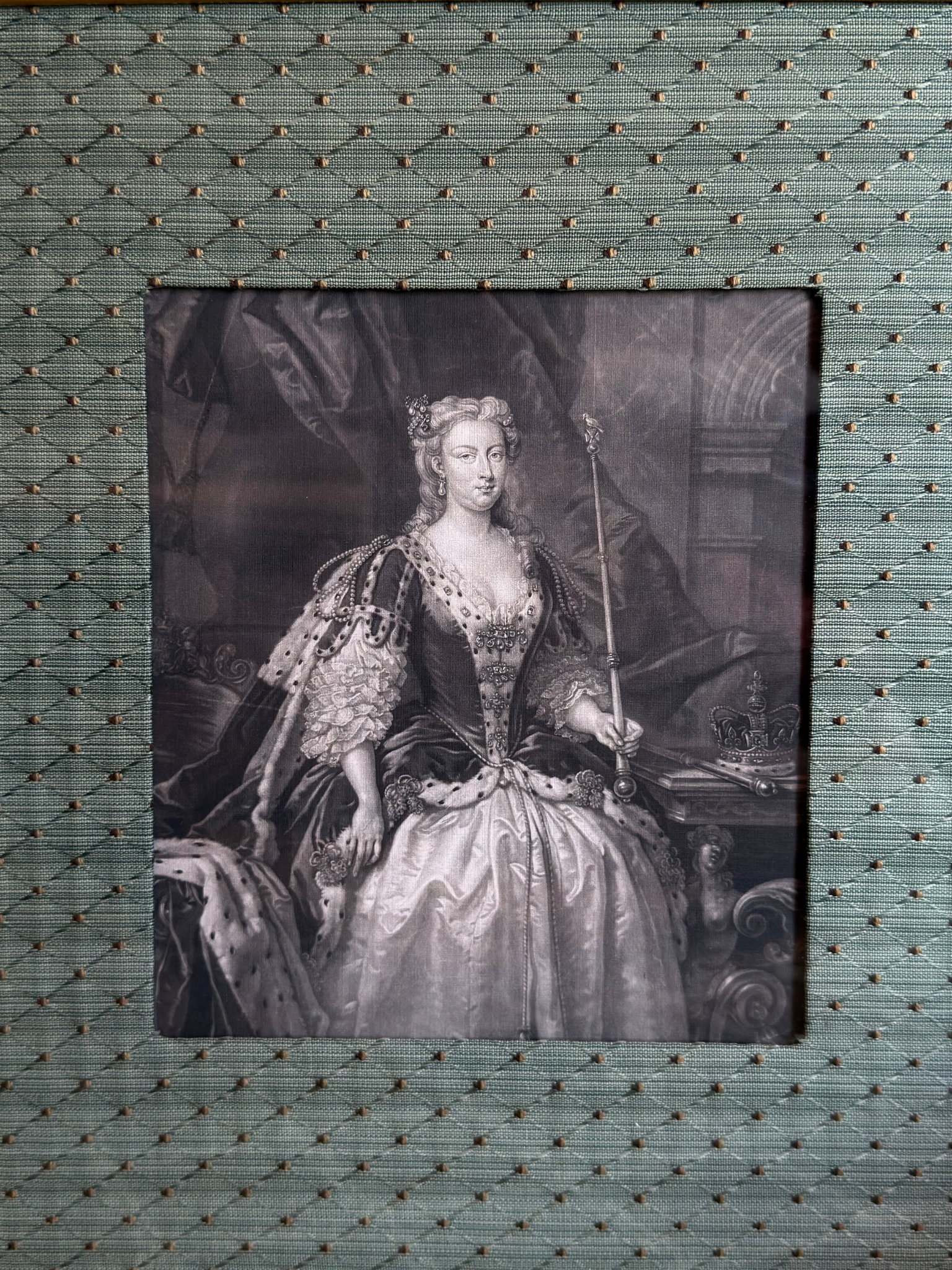 This elegant print depicts Queen Caroline of Ansbach, wife of King George II of Great Britain and Ireland, a queen known for her intellect, wit, and influence over court and politics in the early 18th century. Celebrated for her keen mind and patronage of the arts and sciences, she played a significant role in shaping the cultural and political landscape of her time. The portrait is beautifully presented in a classic gold frame with a handmade French-style fabric mat, making it a distinguished addition to any collection or space.