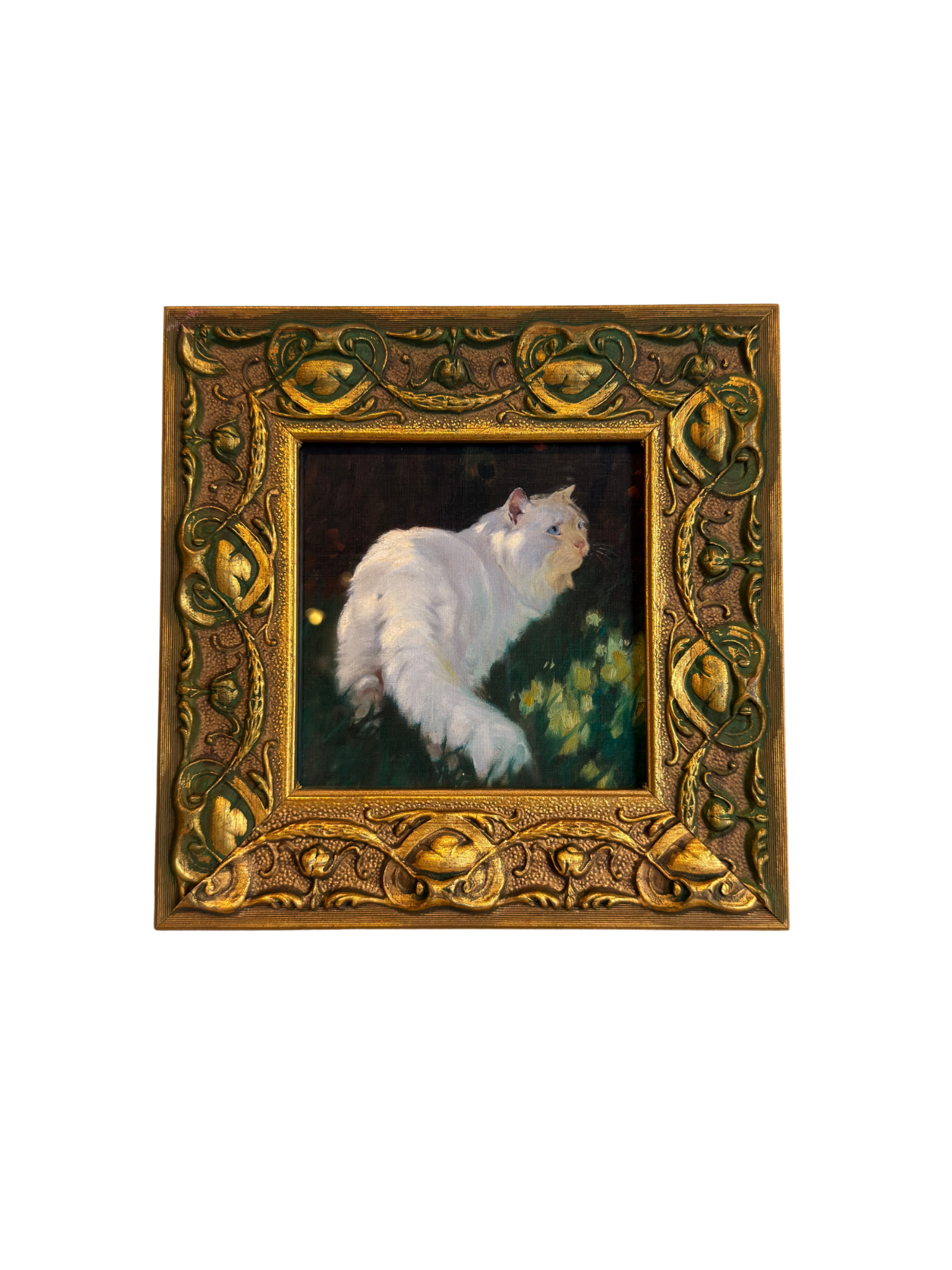 This charming print features a white cat, inspired by the work of German–Hungarian artist Arthur Heyer (1872–1931), celebrated for his naturalistic and sensitive animal portraits, particularly his depictions of cats. Set in an ornate gold frame with green accents, the print is ready to hang and brings a whimsical touch of elegance to any space.