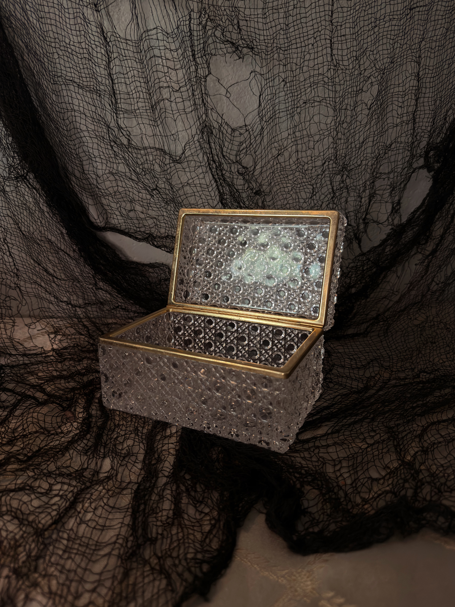 This French diamond-cut crystal casket features a beautifully faceted design and a brass hinge with a natural patina from age. The crystal is in excellent condition, free of chips or cracks. Perfect for display on a shelf, vanity, or coffee table, it’s an elegant way to store jewelry or small keepsakes.
