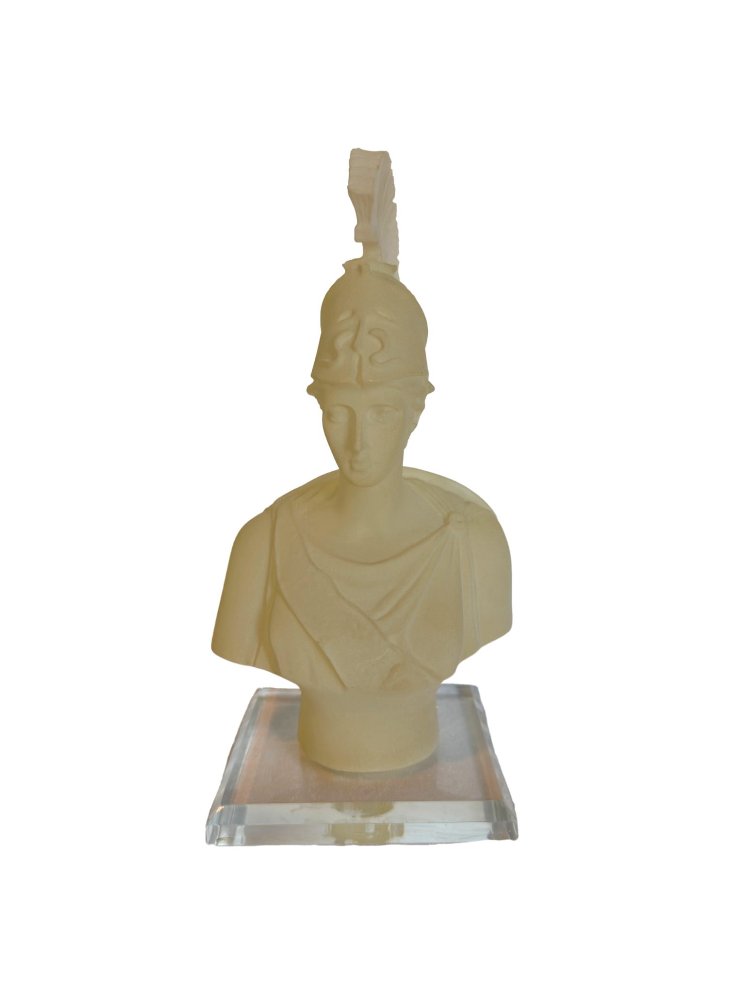 This frosted Lucite statue with acrylic base depicts Athena, the revered Greek goddess of wisdom, courage, and strategic warfare. Known as the protector of cities and a symbol of knowledge and justice, Athena is traditionally portrayed with her helmet and shield. The frosted Lucite material gives this piece a soft, ethereal quality, making it a timeless and inspiring addition to any vintage or classical collection.