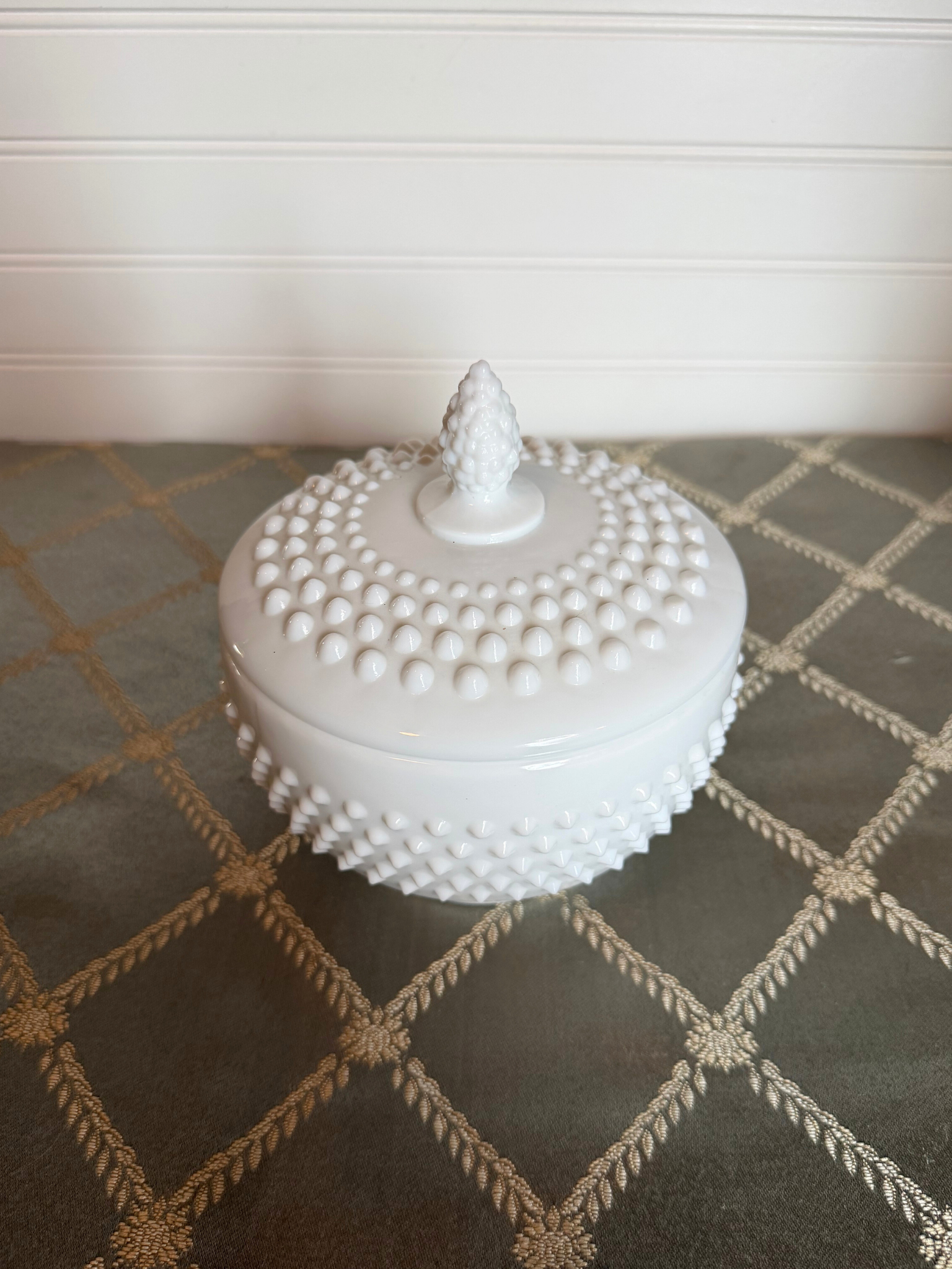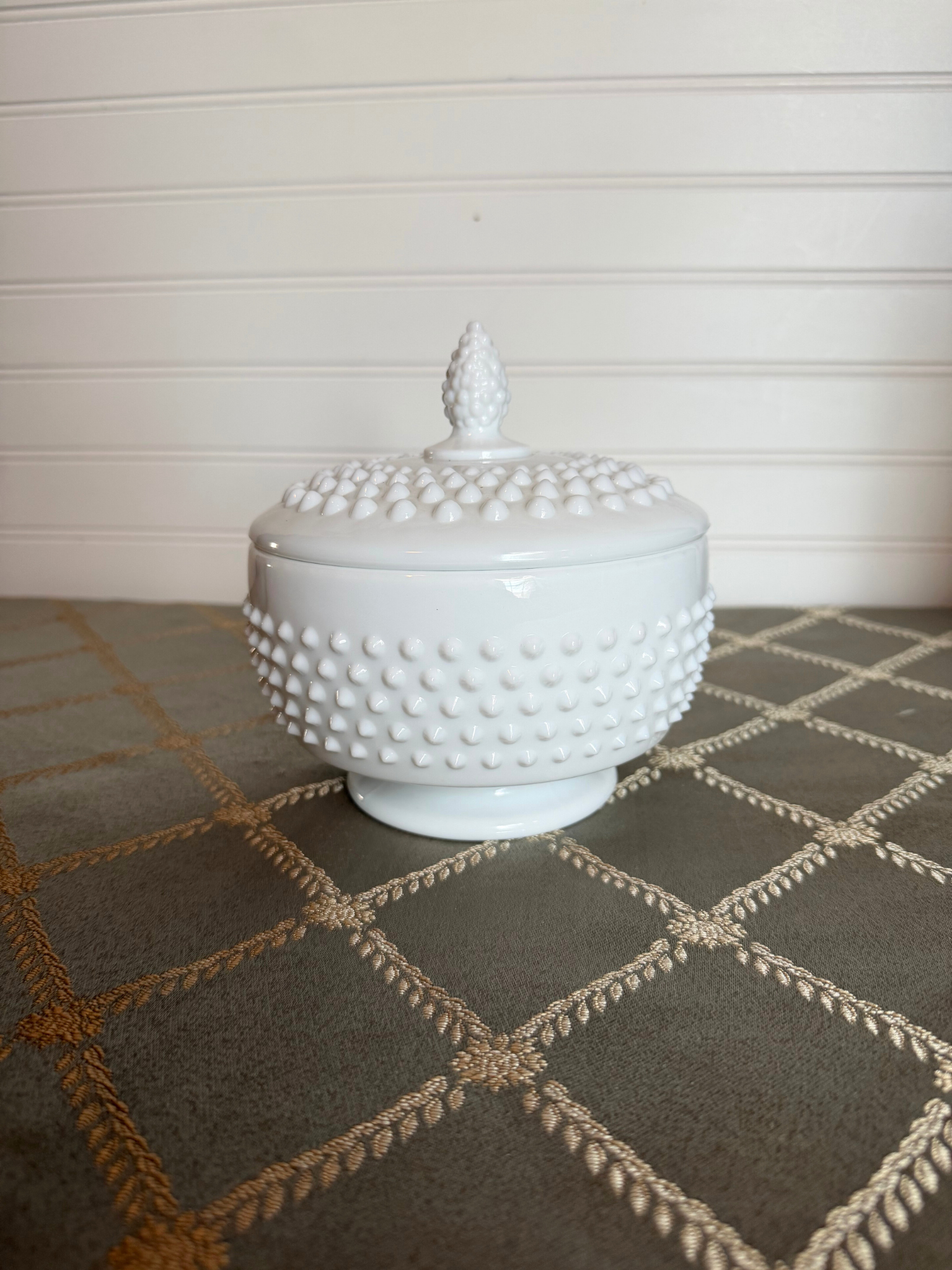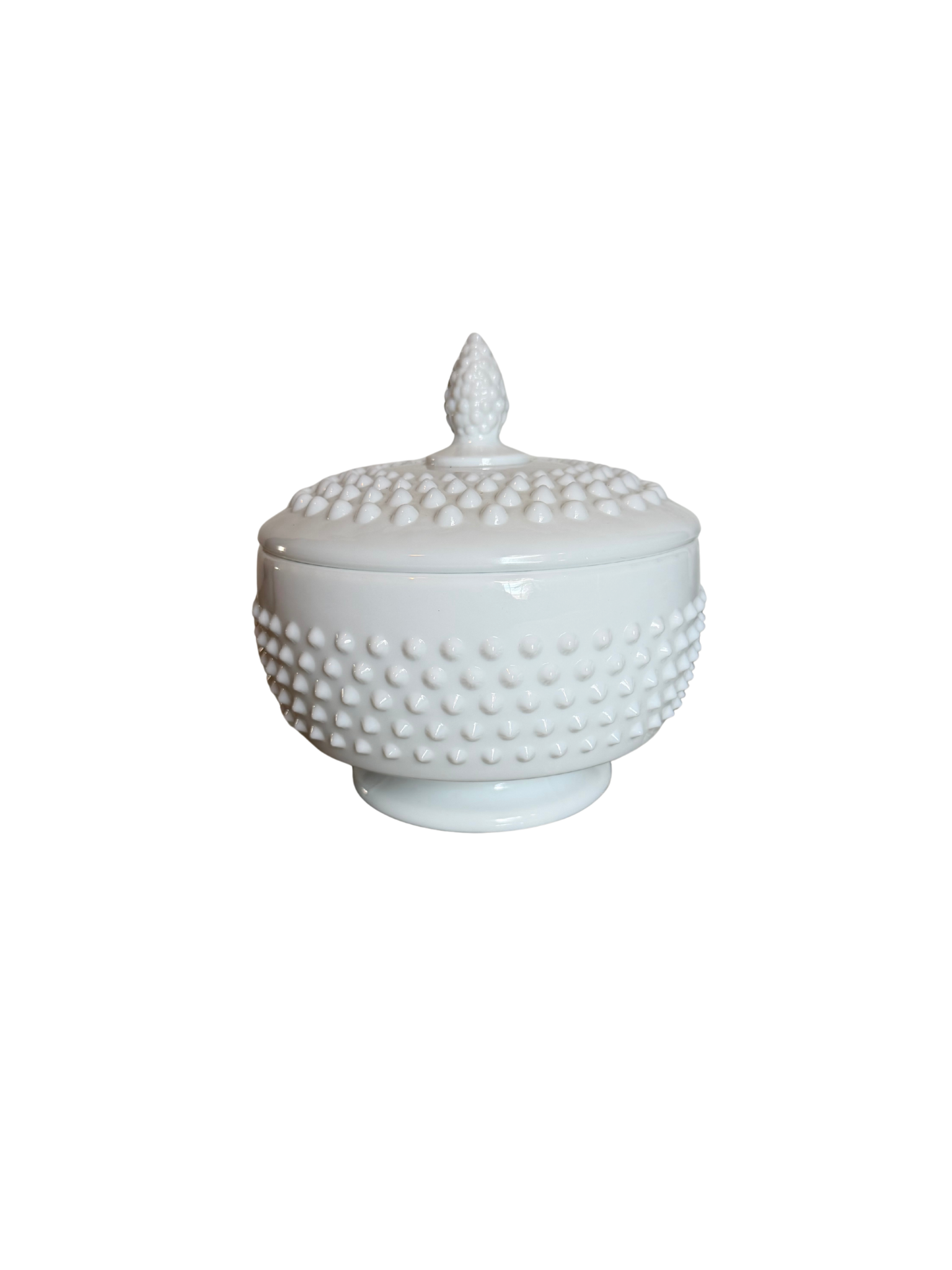 A charming hobnail milk glass lidded dish that blends timeless texture with versatile functionality. Perfect for styling anywhere in the home, it can hold jewelry on a dresser, cotton balls in the bathroom, candy in the kitchen, or small keepsakes in a living room display. Its classic milk glass design and hobnail pattern add a touch of vintage elegance, making it both a practical and decorative addition to any space.