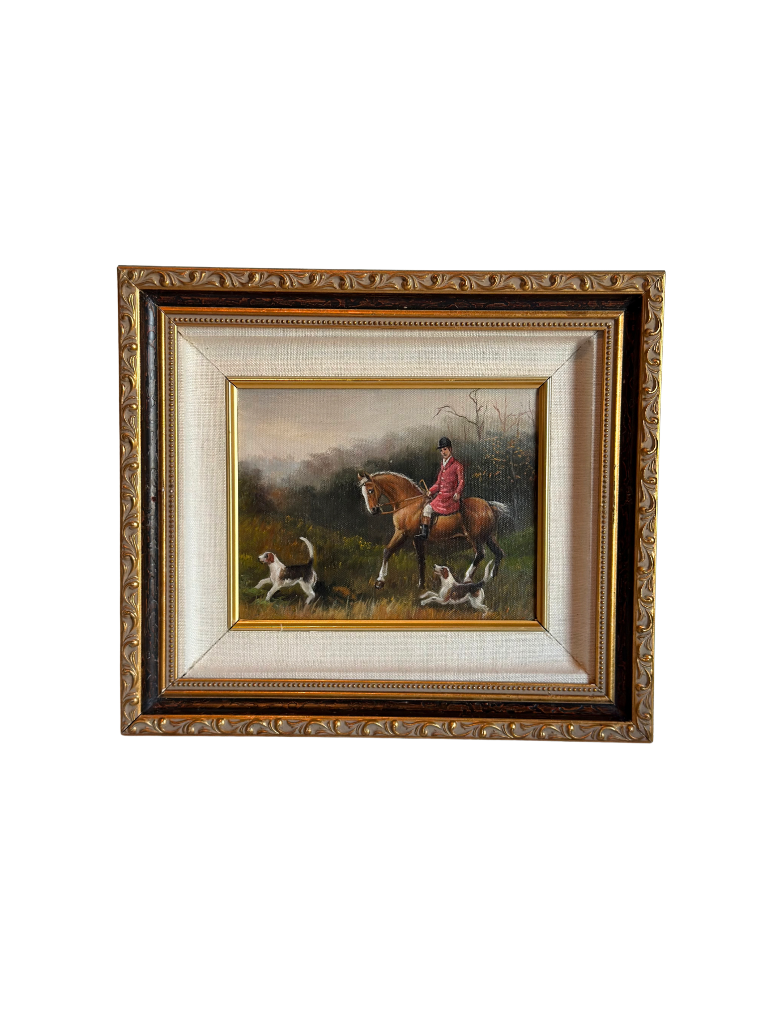 This hunting scene painting shows a man in a red jacket and black hat riding a brown horse through a serene landscape. One hunting dog runs ahead of the horse and rider, while another runs alongside, capturing a lively moment of the outing. The painting is set in a black and gold ornate frame with a white linen border and is ready to hang.