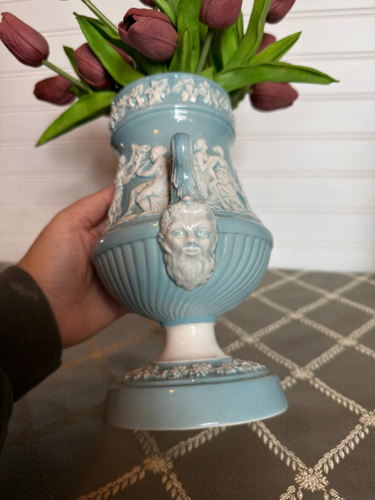 This elegant blue and white Italian porcelain vase features a Wedgwood-inspired design, beautifully depicting mythological gods and goddesses surrounded by intricate leaf and grape motifs. The detailed classical imagery and traditional patterning reflect the timeless artistry of Italian porcelain. Marked Made in Italy on the bottom, this vase is both a striking decorative piece and a testament to fine craftsmanship, perfect for display on a mantel, shelf, or table.