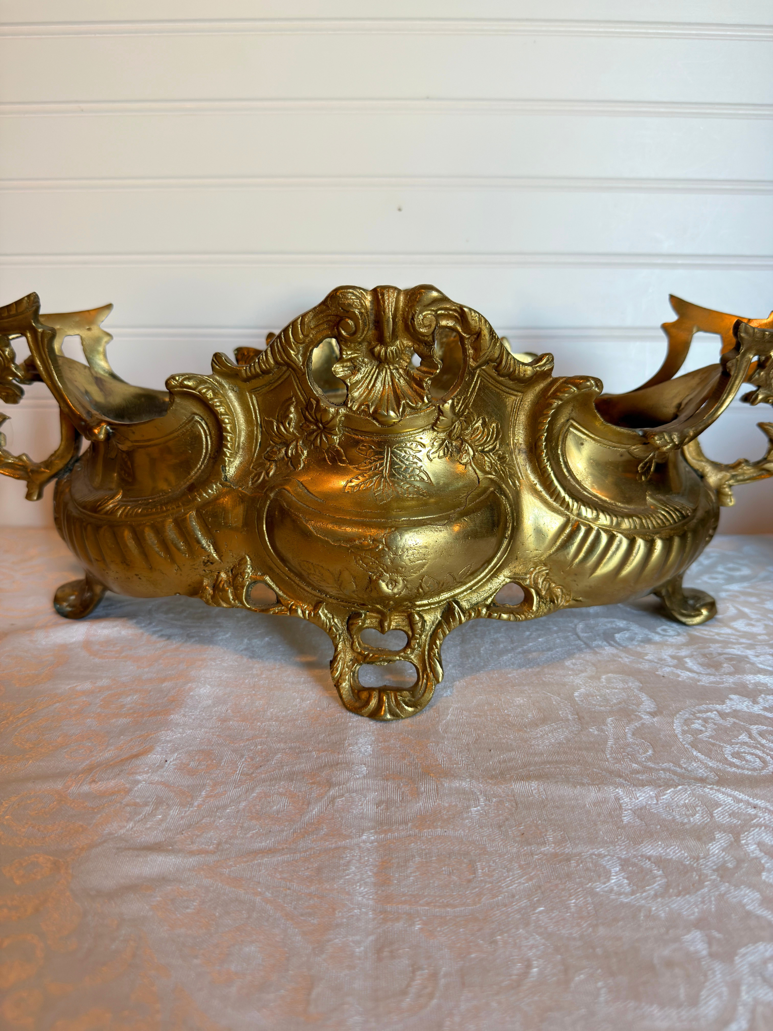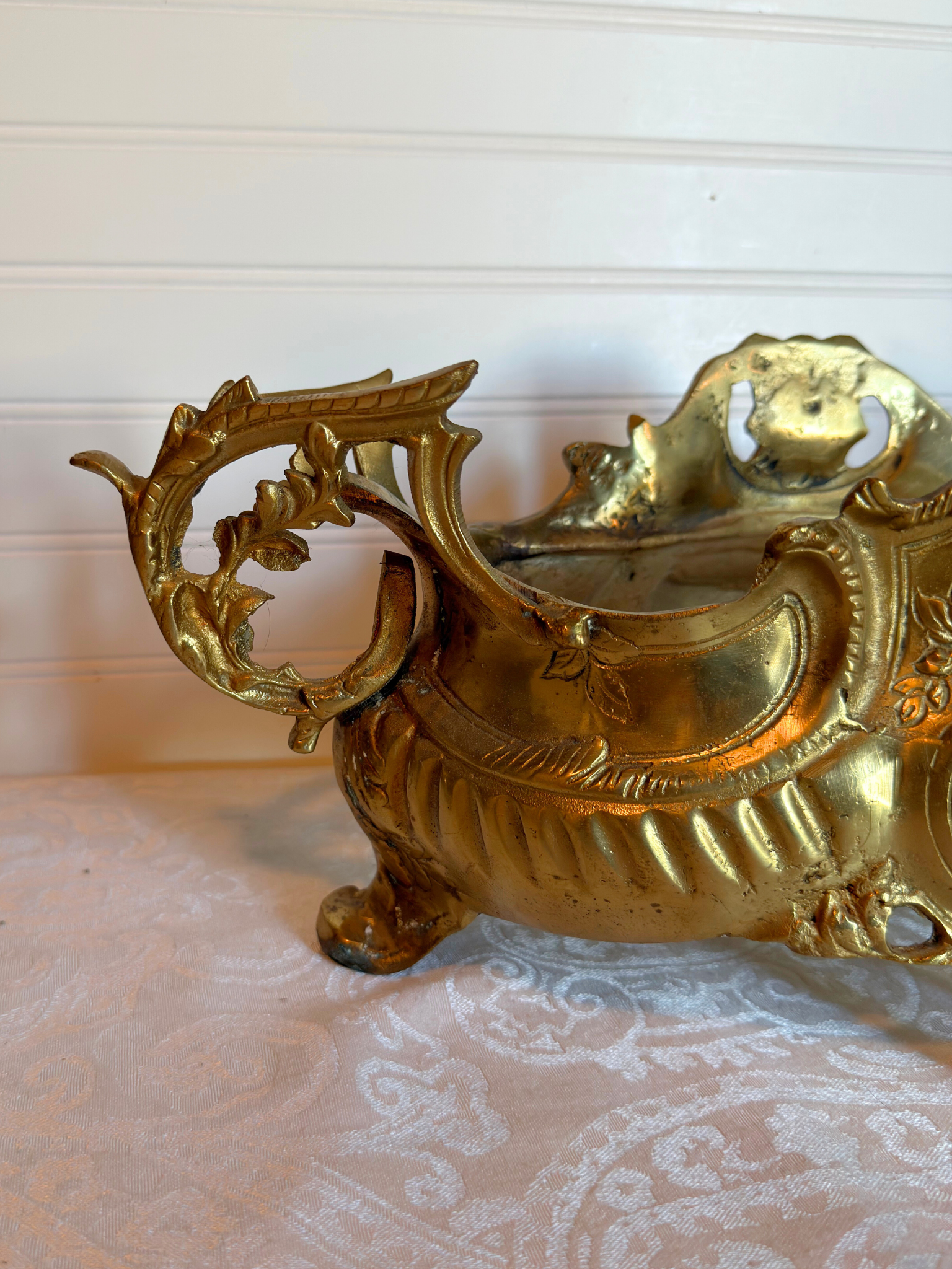 This ornate brass jardiniere features floral and scrollwork details with decorative handles on each side. Traditionally, jardinières were used to hold plants or floral arrangements, often with a removable insert. This piece does not include the original insert, making it a beautiful styling object—perfect for holding books on a shelf or displayed on its own as a decorative accent. It has a substantial weight, and please note the back foot does not fully touch the surface, causing it to sit slightly wobbly.