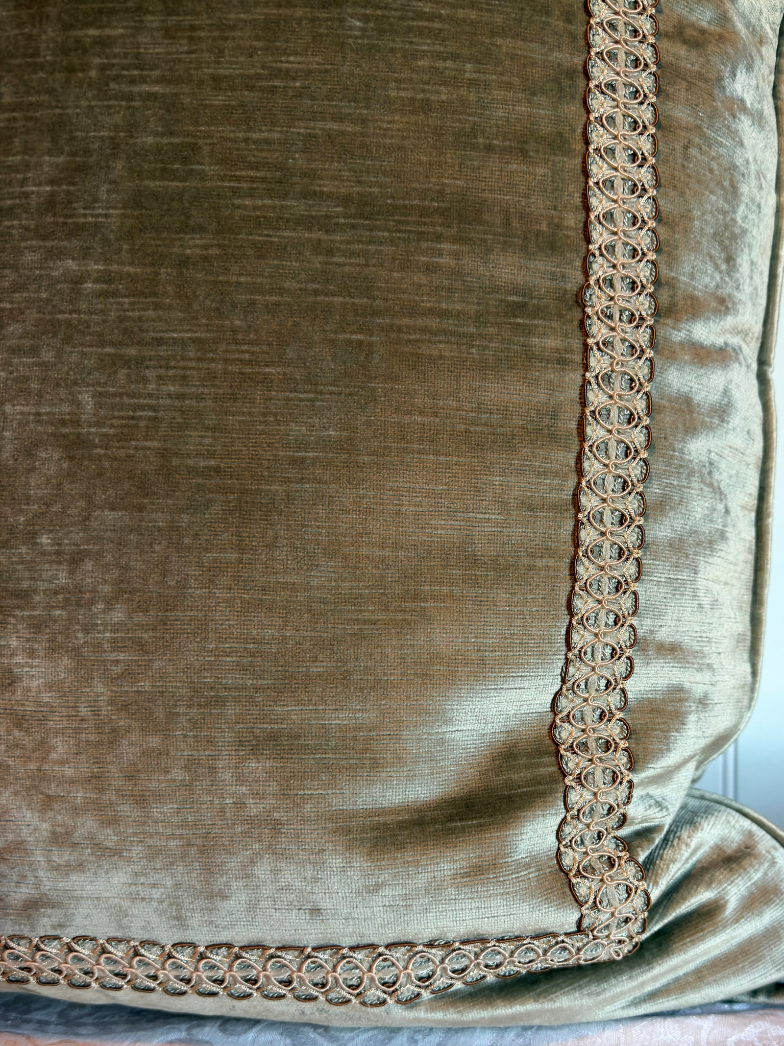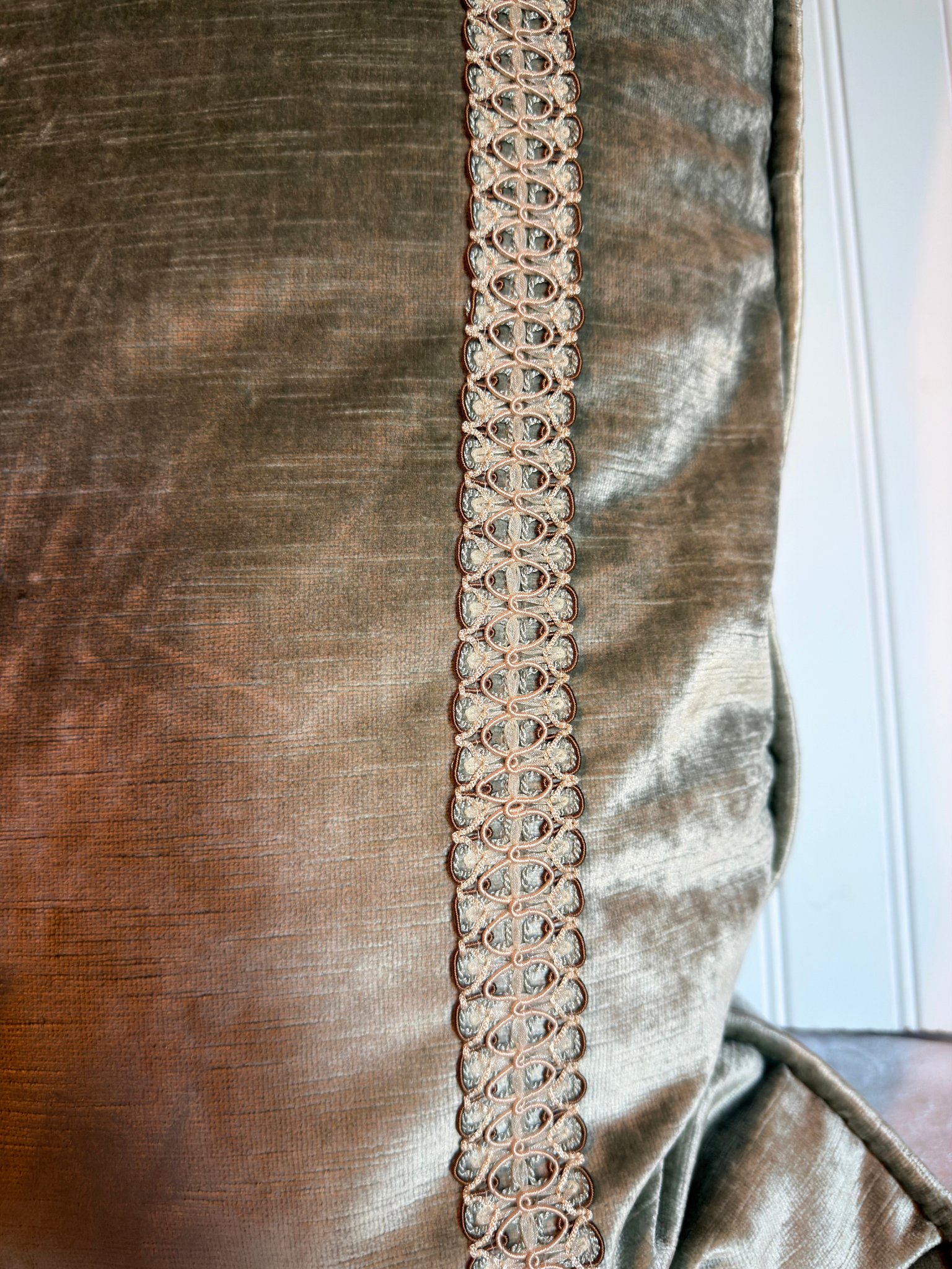 This pair of velvet pillow covers in a soft light blue-green features a rickrack detail along the inner edge for a subtle design accent. Each cover has a zipper, making it easy to insert or remove a pillow and to wash the cover. Perfect for styling on a bed, they add texture and a gentle touch of color while creating a cozy, layered look.