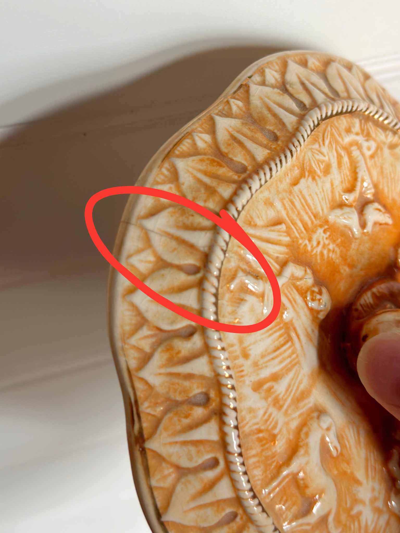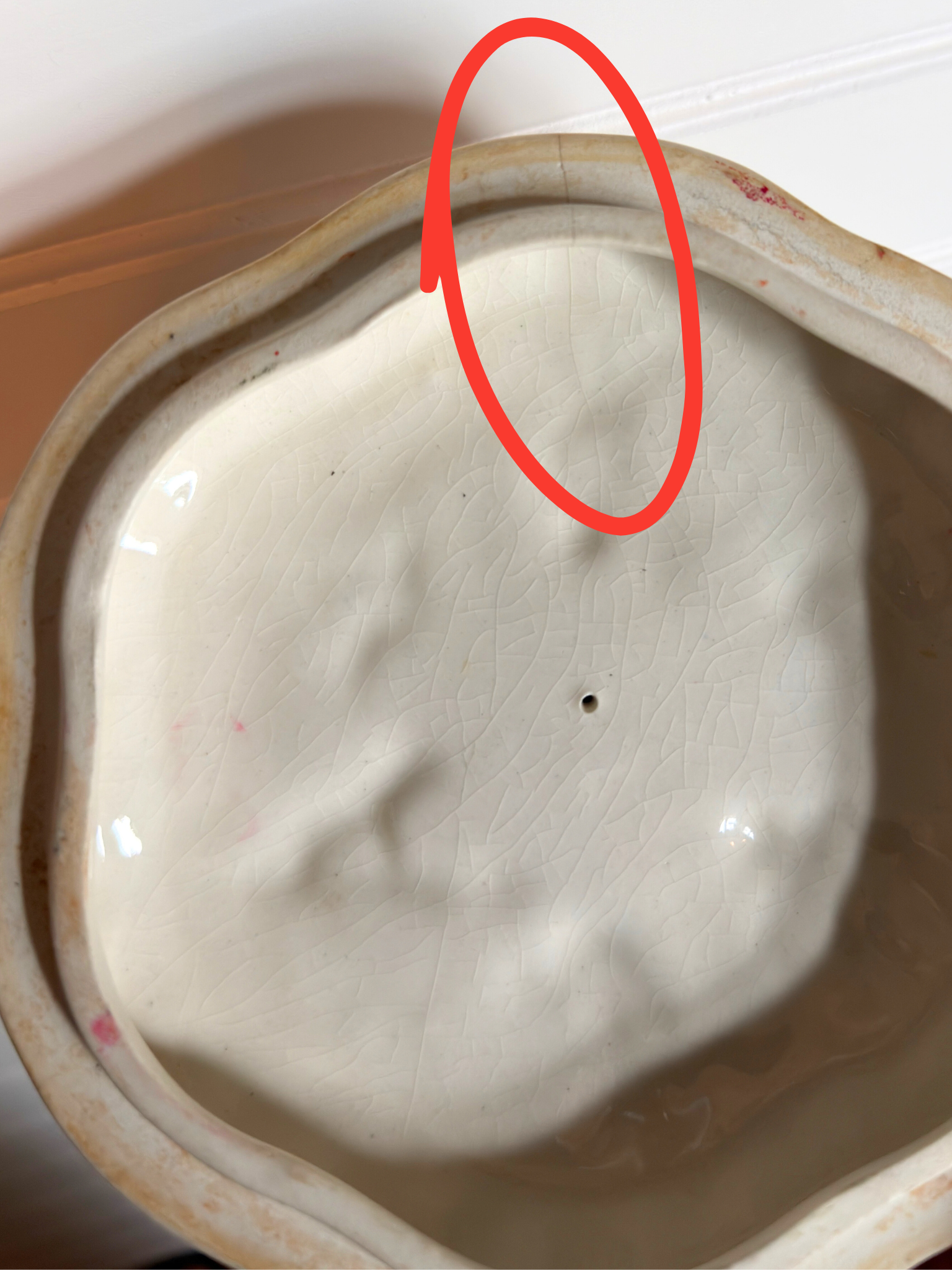- Has no chips, but it does have a slight crack on the lid