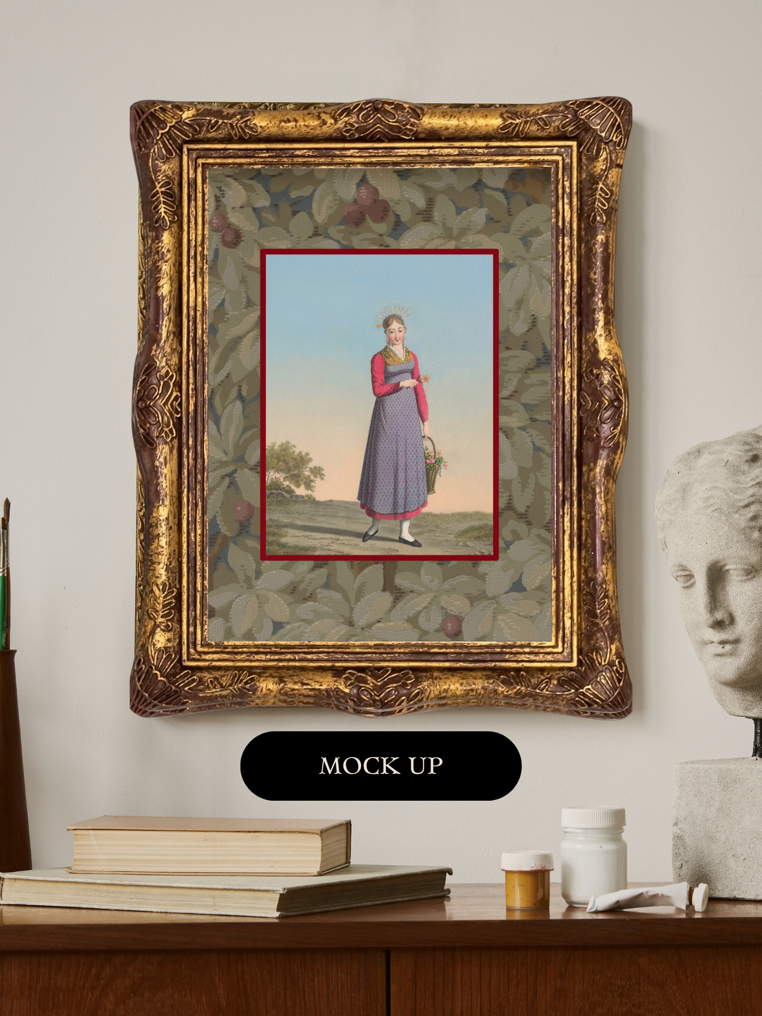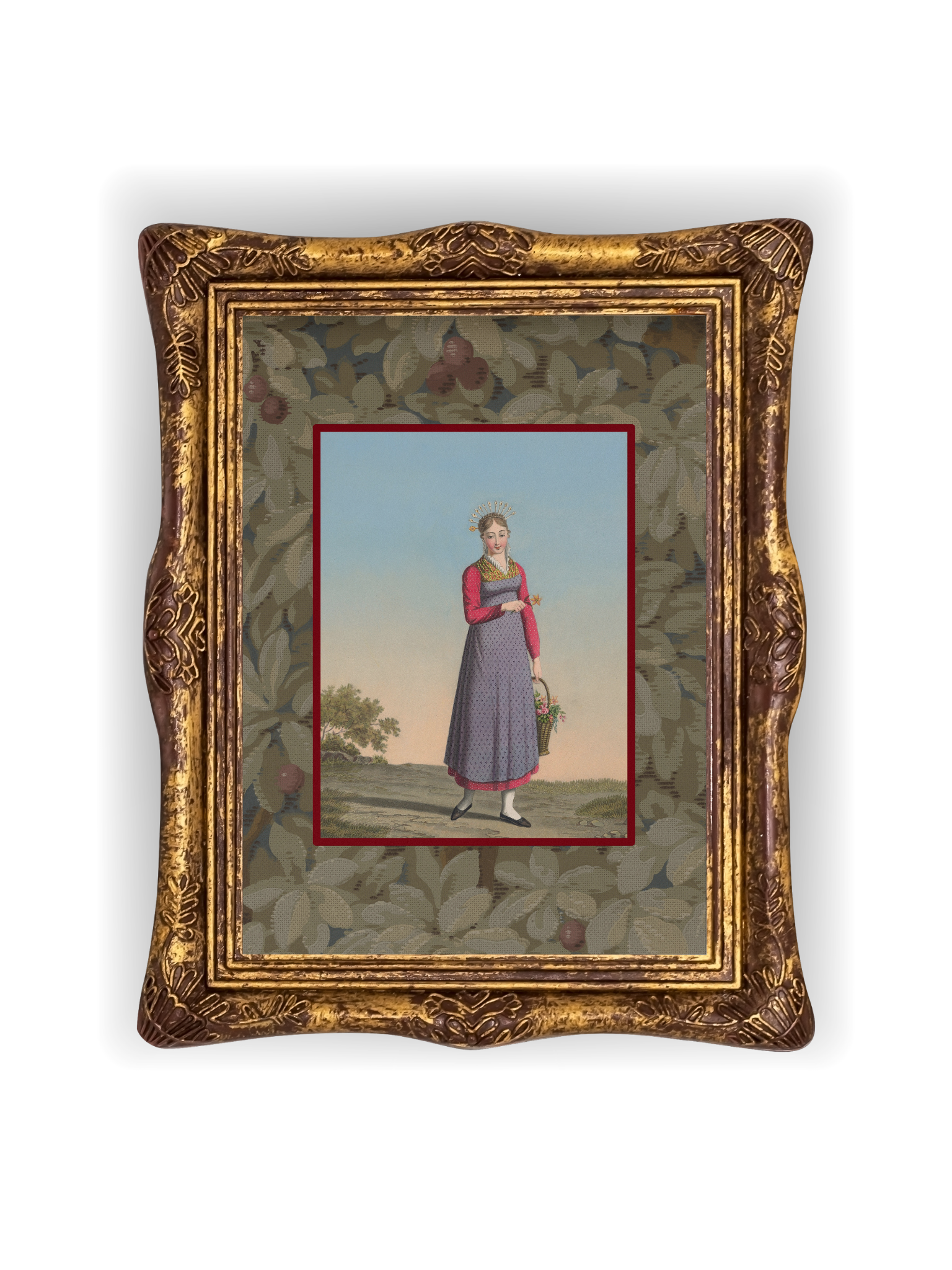 This print features Lucie Maletti, Jeune Fille d'Engadin by Swiss painter and etcher Jean Emmanuel Locher. The portrait shows a young woman in traditional Swedish clothing holding a basket of flowers, captured with delicate detail and charm. The print features a decorative border of an aubbsson style tapestry with a floral leaf design and is available exclusively in the 8×10 size.