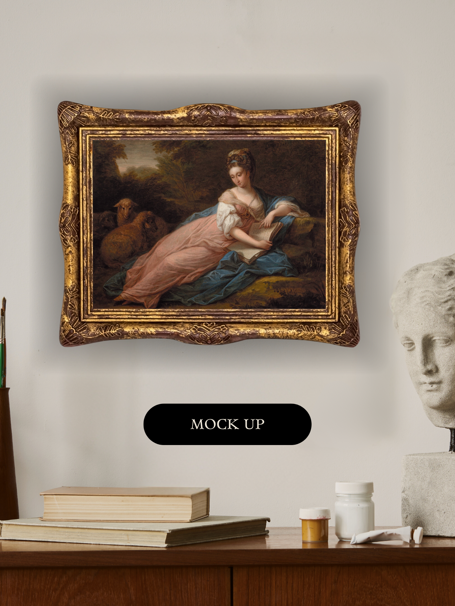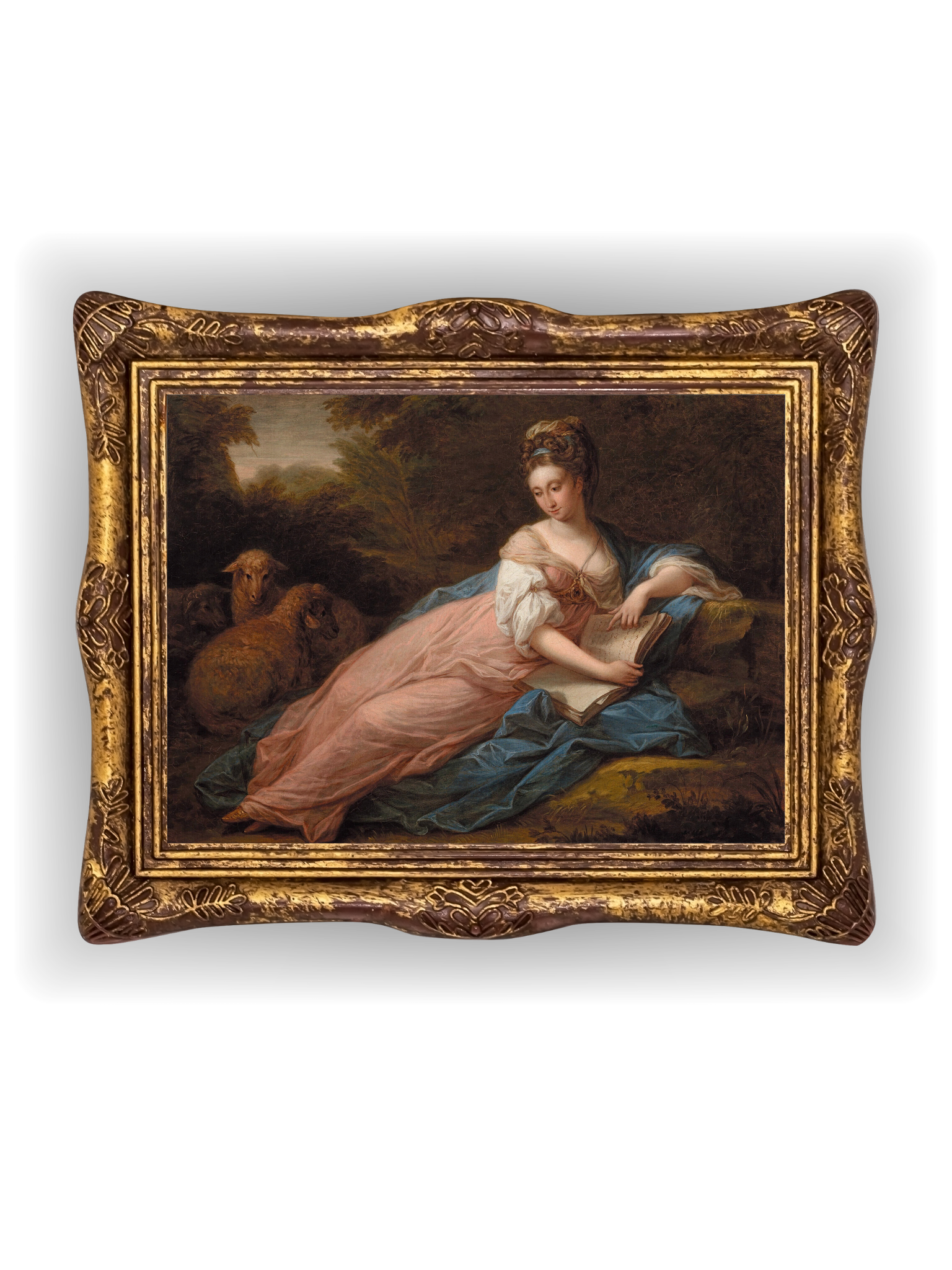 This print features Portrait of Mary Tisdal Reading by Angelica Kauffmann, the Swiss-born Neoclassical painter celebrated for her graceful and expressive portraits in 18th-century Europe. The artwork depicts a reclining lady in a pink and blue dress, holding a book, surrounded by gentle sheep in a serene landscape.