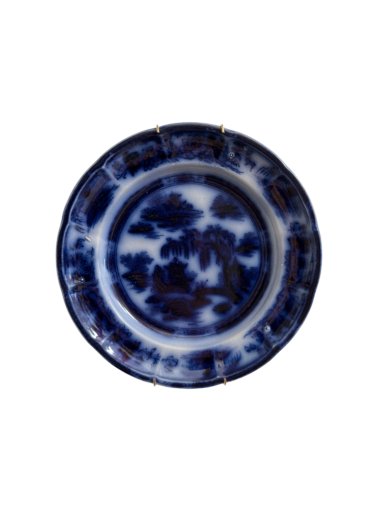 Type: Flow blue earthenware (also called Oriental Stone), known for its blurred cobalt glaze that "flowed" during firing