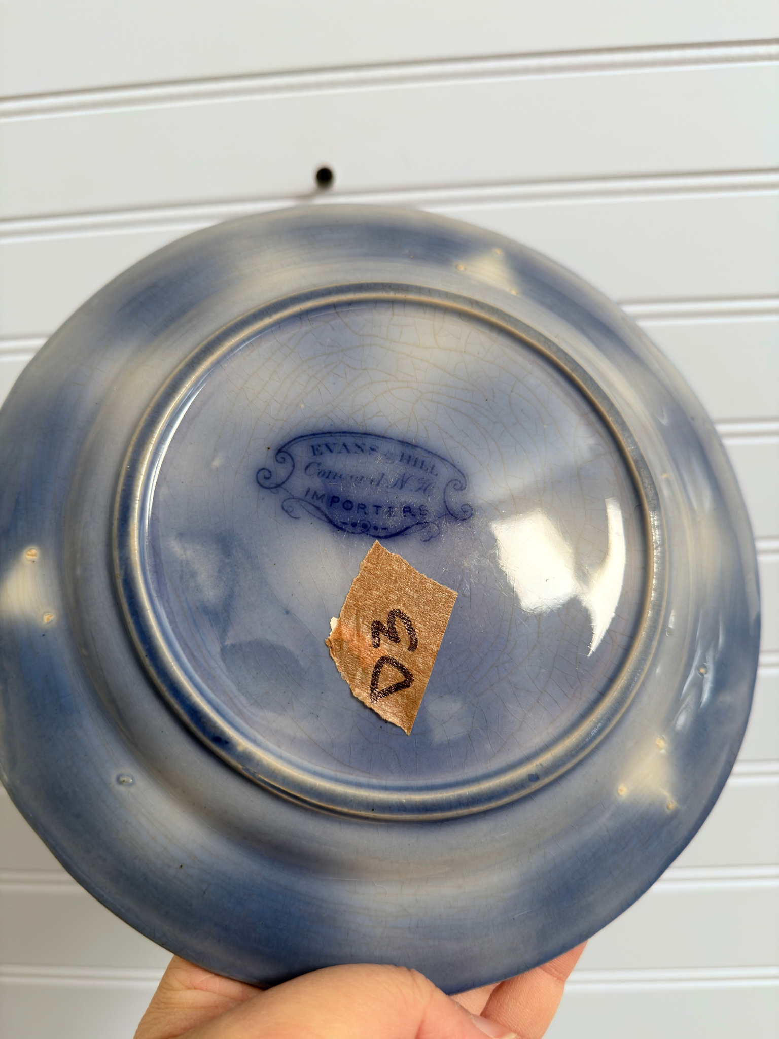 This antique flow blue plate dates to the late 19th century and was made in England for the American market. It bears the retailer’s mark of Evans & Hill of Concord, New Hampshire, a detail that ties the piece directly to its journey from Staffordshire to a small New England shop.