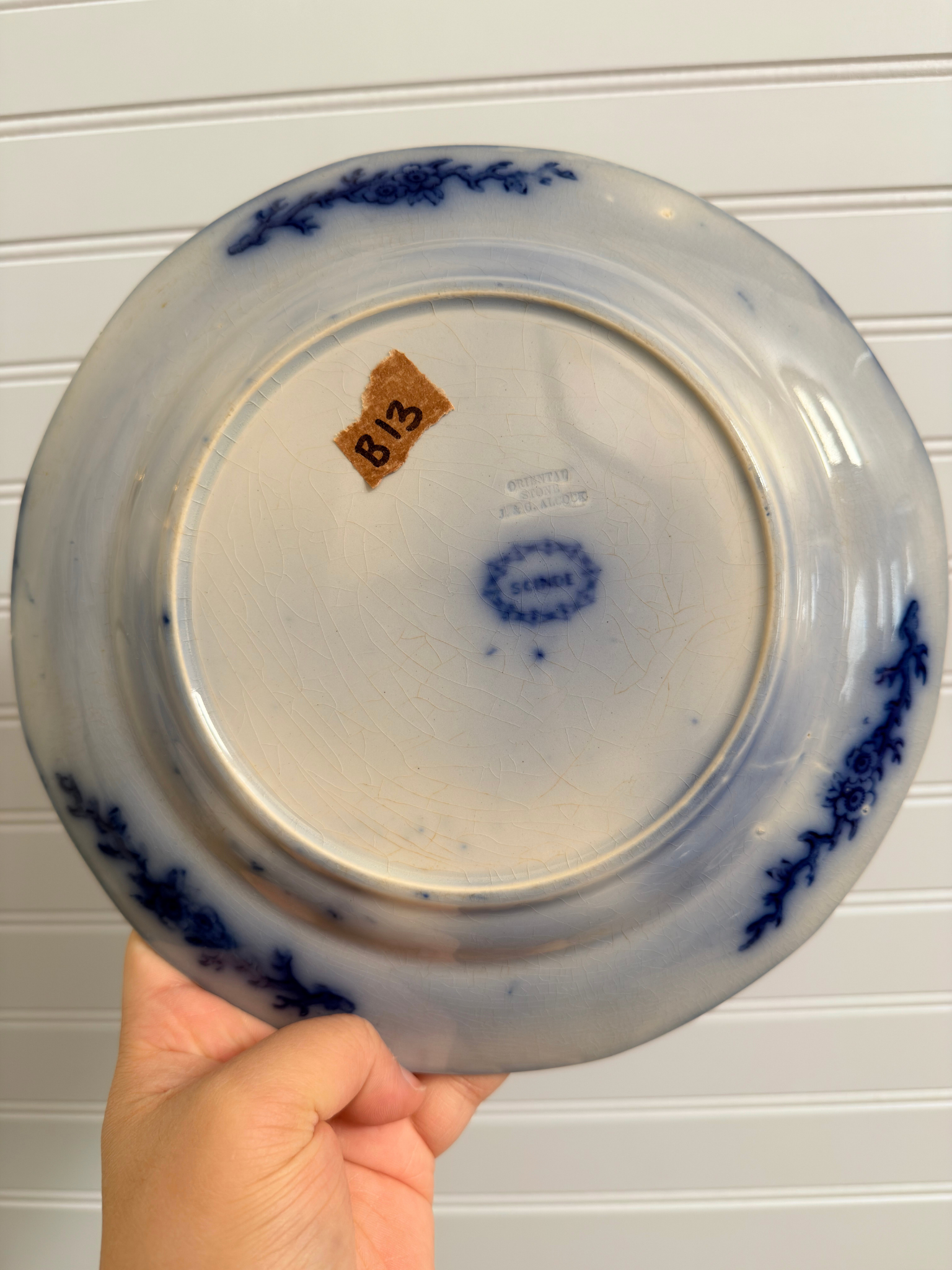 Type: Flow blue earthenware (also called Oriental Stone), known for its blurred cobalt glaze that "flowed" during firing