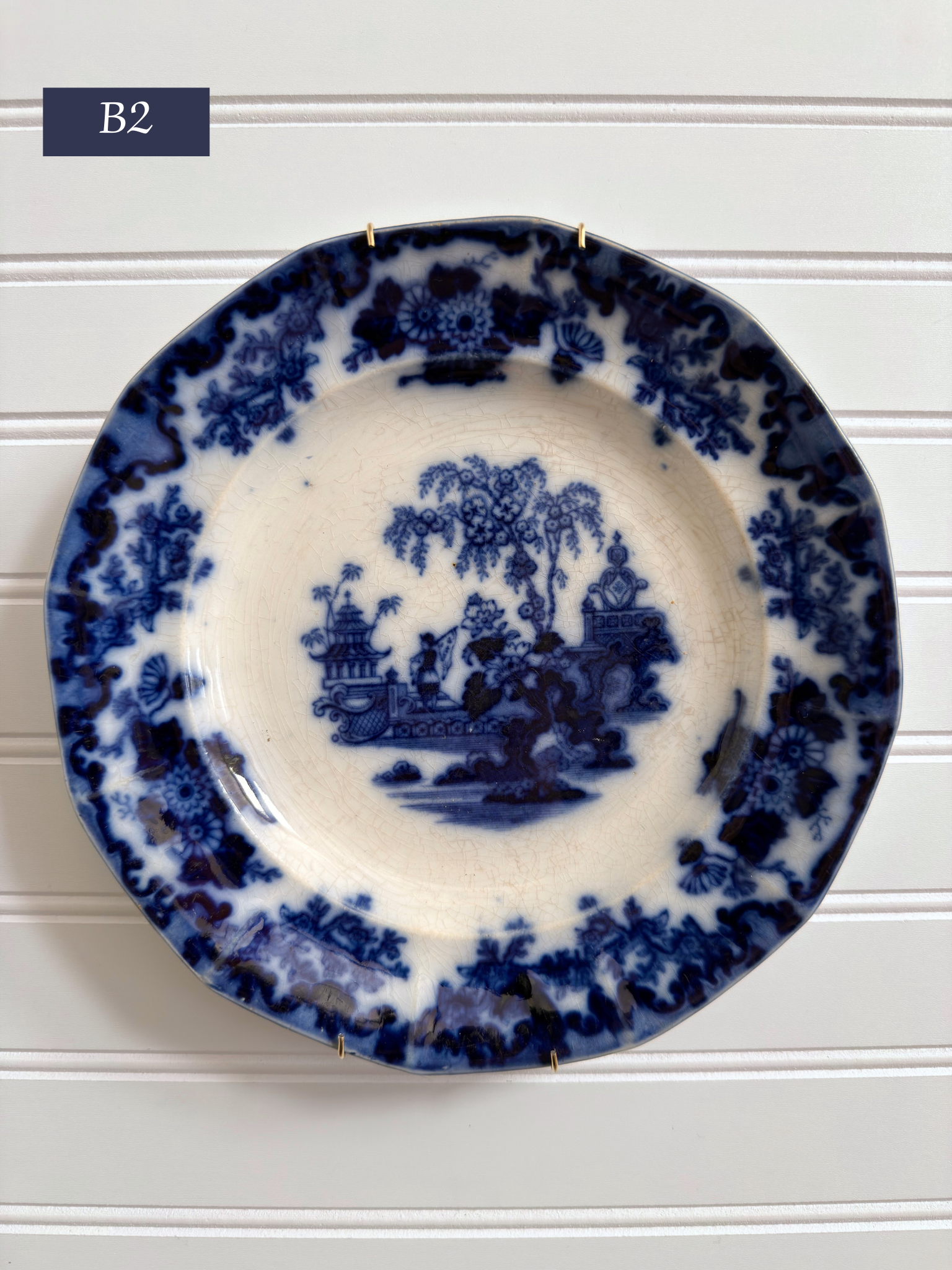 These medium J & G Alcock "Scinde" flow blue plates were produced in Staffordshire, England around the 1840s by the John & George Alcock company (active 1839–1846). The "Scinde" pattern features an Asian-inspired scene with willows, temples, and floral details, reflecting the Victorian fascination with Oriental designs and named after the Scinde province in India.