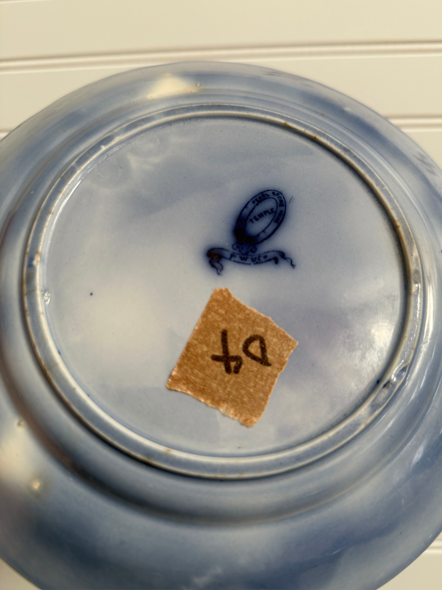 This Podmore Walker & Co. “The Temple” flow blue plate was produced in Staffordshire, England during the late Victorian period. The pattern depicts a detailed Oriental-inspired scene with temples, bridges, and landscape elements, rendered in rich flow blue tones that gently bleed into the glaze, a hallmark of this decorative technique.