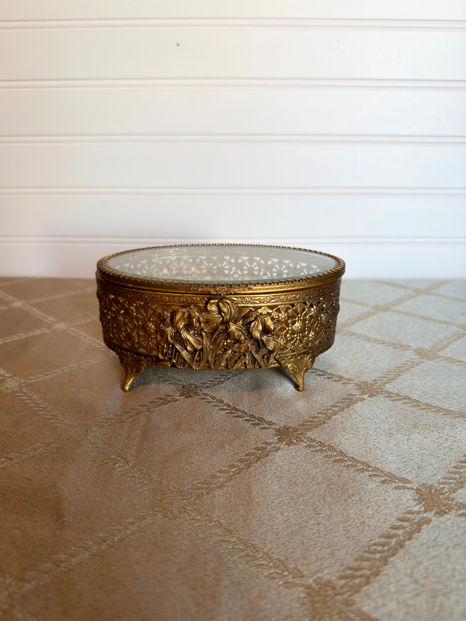 This exquisite ormolu jewelry casket features ornate floral detailing on the front, showcasing intricate craftsmanship and timeless elegance. Lined with rich tan-orange fabric, it’s perfect for displaying your favorite jewelry pieces or styled open with a portrait for a charming decorative touch.