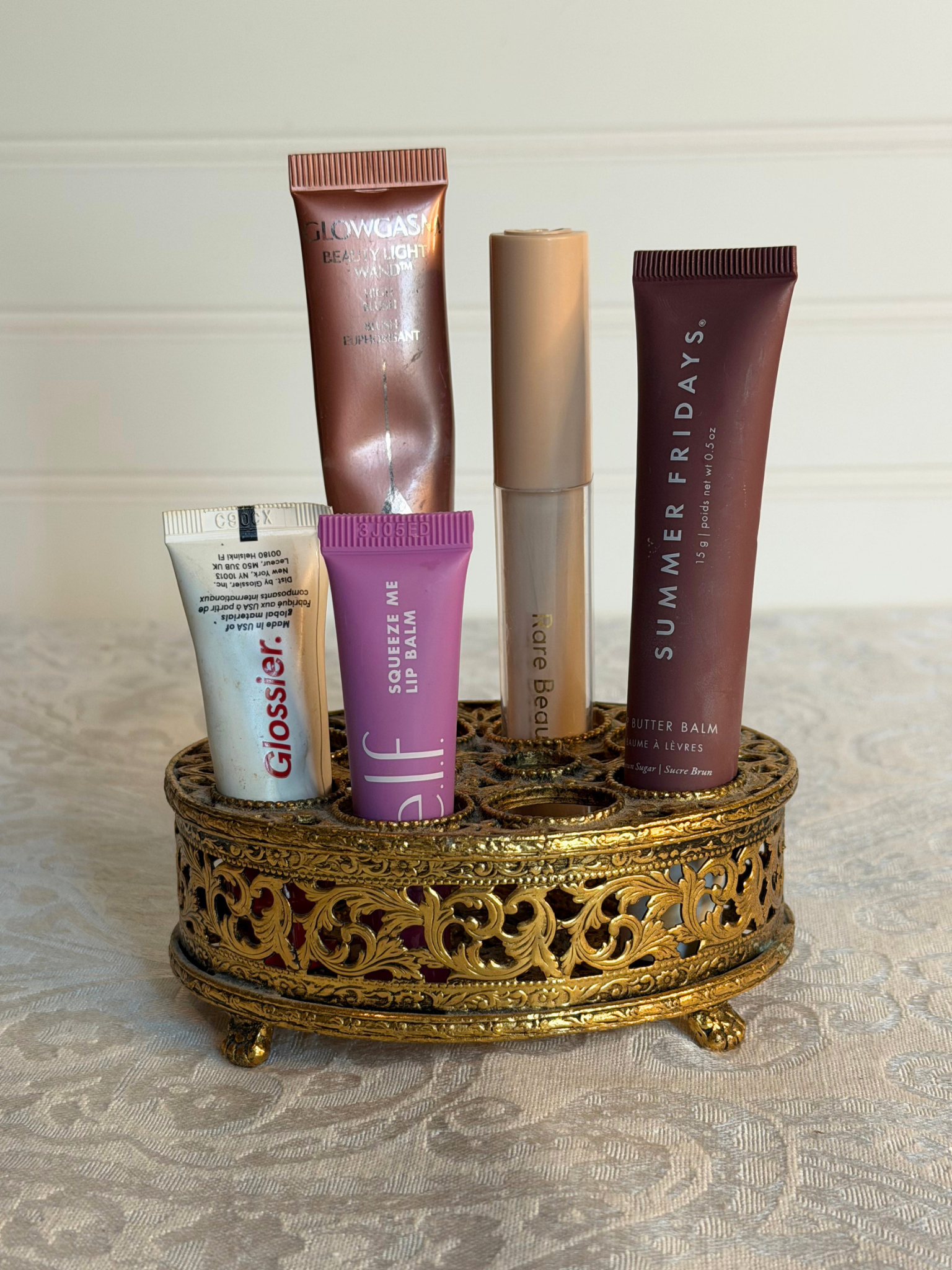 This is a vintage ormolu oval lipstick holder set on four small lion feet. The top features eight openings for standard lipsticks and two smaller holes for lip liners, while the sides are detailed with scrollwork throughout. It is a charming piece, perfect for displaying your favorite lip balms and lipsticks on a vanity.