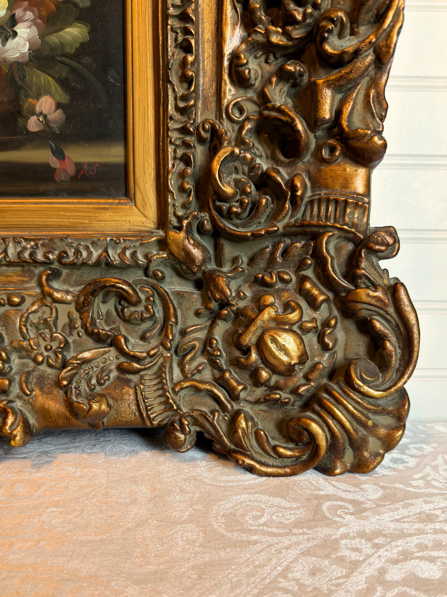 This is a large, chunky, ornate dark bronze gold frame featuring intricate floral and scrollwork details. Inside the frame is a moody floral painting depicting a brass vase on a table, filled with a vibrant arrangement of flowers and leaves in white, yellow, orange, blue, pink, and green. The rich tones of the painting paired with the elaborate frame create a dramatic and elegant statement piece, perfect for adding character to any room.