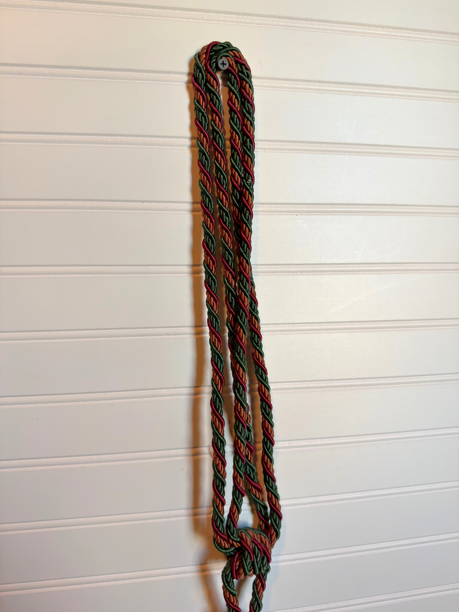 This pair of vintage green and red curtain tieback tassels is beautifully crafted with intricate detailing, showcasing the artistry and elegance of classic design. Perfect for tying back curtains, they can also be draped around chunky lamps, or used as decorative accents on furniture or door handles. A versatile and stylish way to add a touch of color and texture to your home dΓ©cor.
