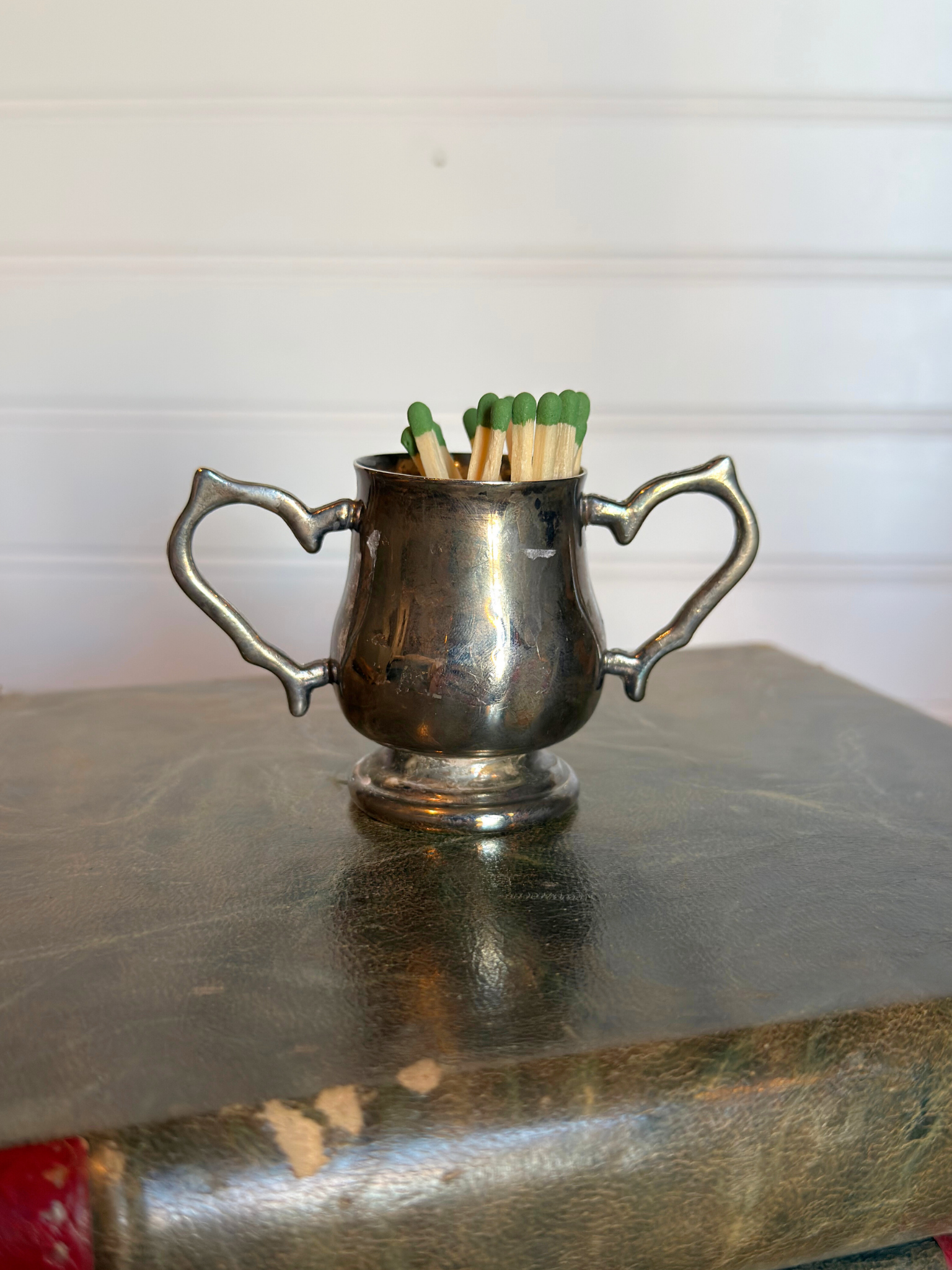This small silver-plated trophy-style holder is perfect for holding matchsticks or toothpicks and adds a touch of classic elegance to any space. Its compact size and finish make it ideal for styling near a candle, on a mantel, or anywhere in the home where a little decorative flair is needed. A charming and versatile accent piece that blends function with timeless style.