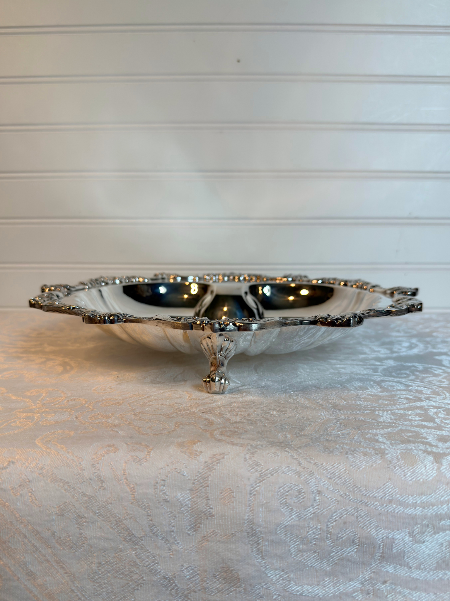 This Royal English by Wallace silver-plated seashell serving tray features three ornate scrollwork feet and a floral and scrollwork detailed edge. With a substantial weight, it is perfect for serving when hosting or as a decorative accent on an entry table, vanity, or coffee table to hold small items.
