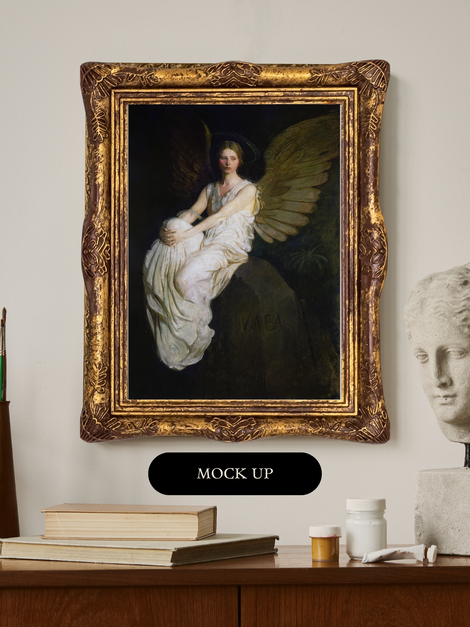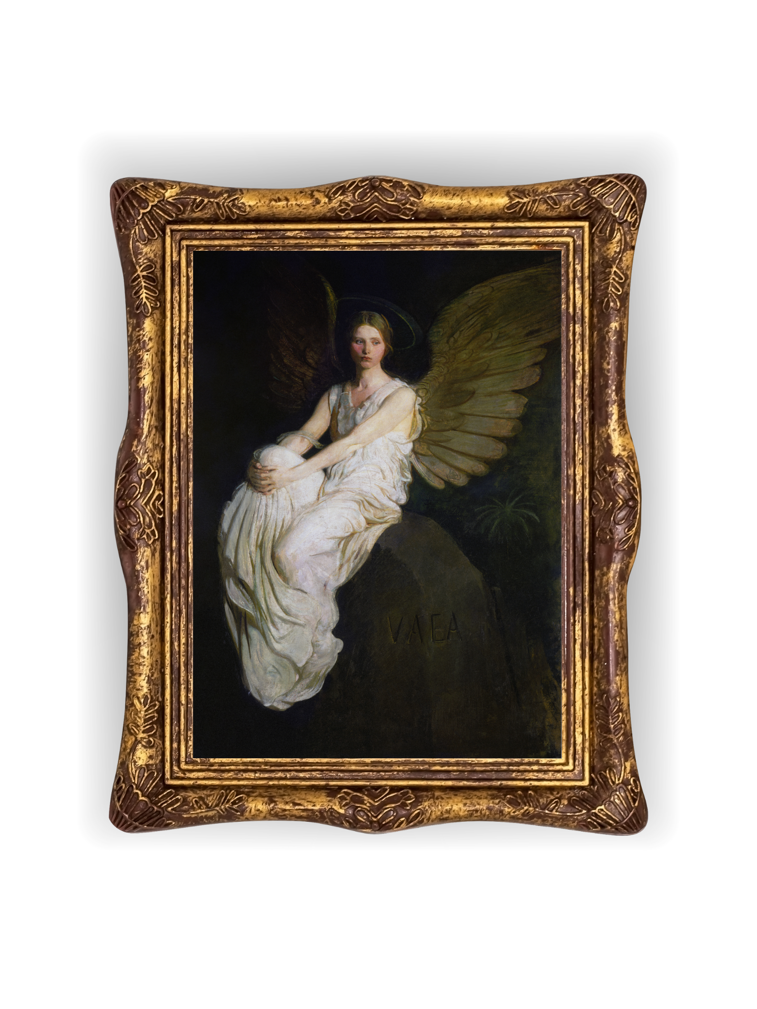 This print features an angelic figure in a serene landscape, created as a tribute to writer Robert Louis Stevenson. Thayer, an American artist known for his symbolic and spiritual imagery, often explored themes of beauty, nature, and transcendence.